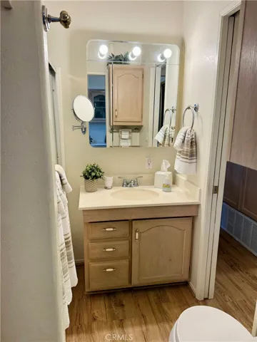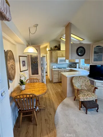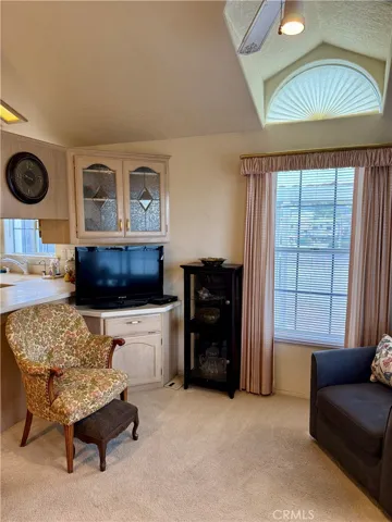 Inside, the light-filled interior showcases a stunning gourmet kitchen designed to impress, featuring Corian countertops, all-white appliances, a skylight, and hardwood flooring. Every detail has been carefully curated to blend comfort, functionality, and upscale appeal. The inviting living room offers wingback chairs, custom draperies, a ceiling fan, and a television—perfect for a relaxing night in enjoying your favorite movie or show.