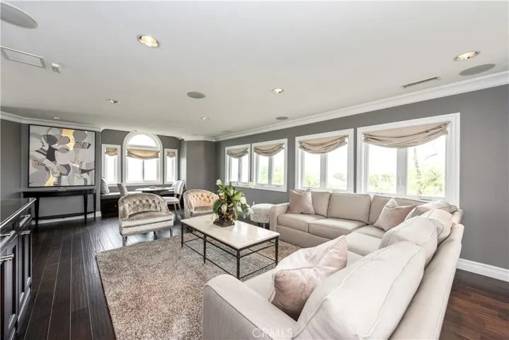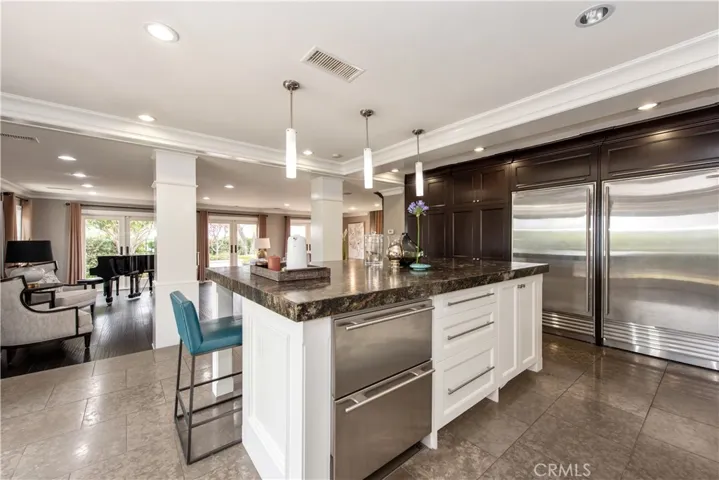 The home has 6 bedrooms, 4.5 baths, an additional bonus suite with a kitchenette and 3-car garage. Soaring ceilings lead to formal living with fireplace; gourmet kitchen hosts 2 large extra large islands with custom top., designer appliances furnishes the kitchen with Wolf, Sub-Zero, Miele appliances,combined with fine cabinetry with a walk in pantry.