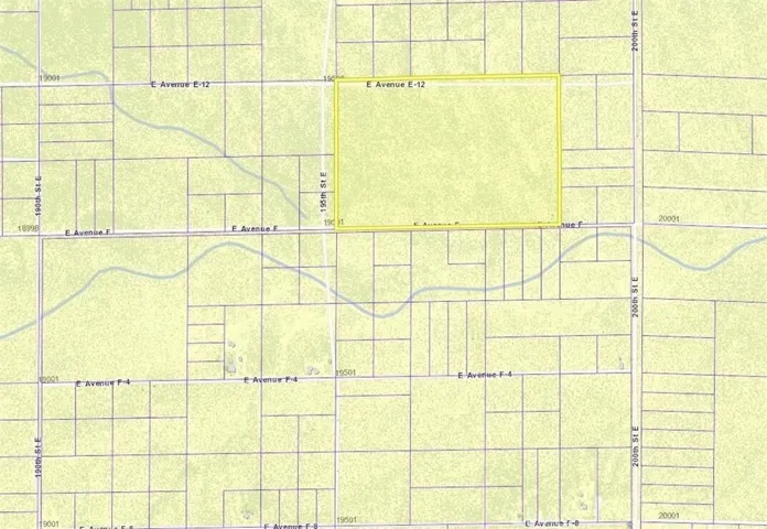 61.79 flat acres in the Hi Vista area of East Lancaster. The lot has 2011 feet of frontage on Ave F and 1339 feet along 195th St E to Ave E12 which runs along the north border of the lot. APN 3316-010-028. Power poles are a quarter mile away on 195th St E and about 700 feet away on 200th St E. Zoned A11 for agriculture, animals, and a home. Located close to the ”Kill Bill” church film site.