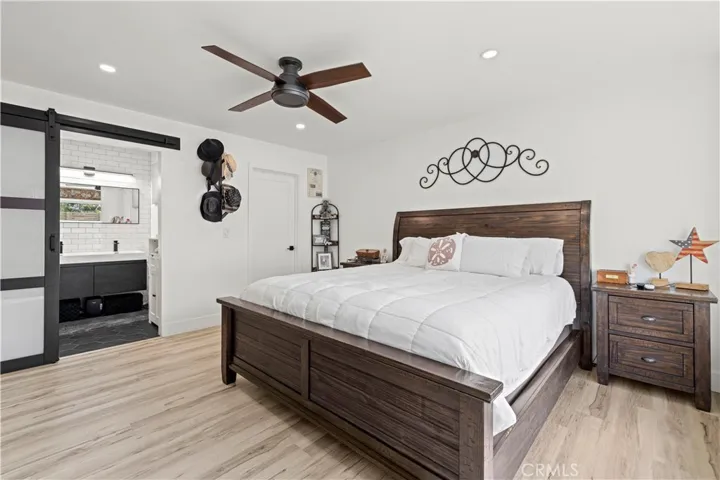 The residence offers two spacious bedrooms and two full bathrooms. The primary suite serves as a private sanctuary, boasting a spa-inspired bathroom with a floating double vanity and a frameless glass walk-in shower featuring dual shower heads.