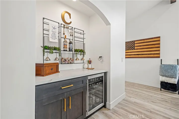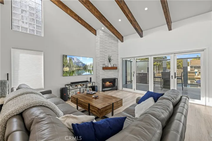 The interior is flooded with natural light courtesy of soaring beamed ceilings and strategically placed skylights. The open-concept living space features updated flooring and unique indoor-outdoor integration using modern bi-fold doors that open to an expansive waterfront deck and private dock. At the heart of this home sits a gourmet chef’s dream kitchen equipped with high-end appliances, sleek quartz countertops, and an oversized center waterfall island with breakfast bar seating—perfect for entertaining while taking in the unforgettable views.