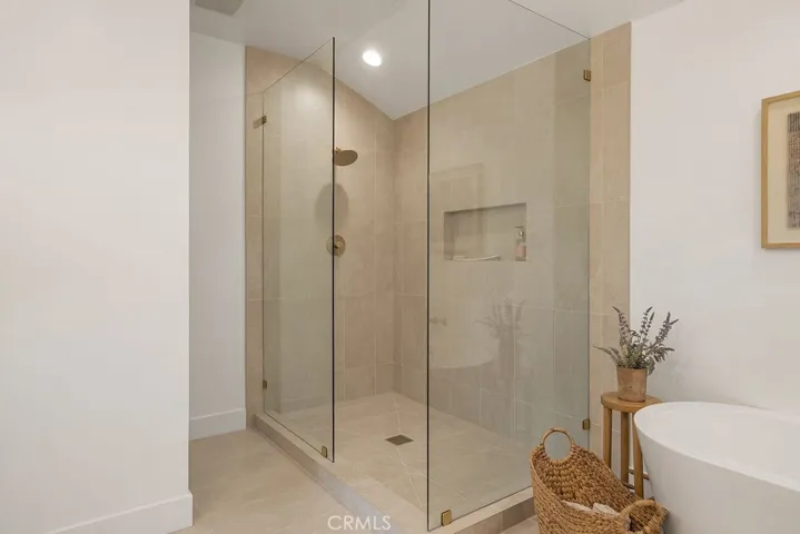 The living room is calm and inviting, centered around a Horizon stone fireplace and framed by a picture window that fills the space with natural light. The guest bathroom is finished with Edward Martin Calcutta flooring, while the primary suite is designed as a private retreat. The spa-inspired primary bathroom showcases large-format designer tile, a custom glass-enclosed shower, a generous soaking tub, and a walk-in closet.