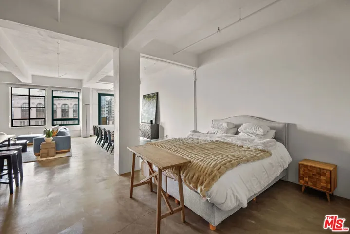 High above on the 11th floor at the iconic and historic landmark Eastern Columbia building is a beautifully maintained LIVE/WORK loft w/ rare balcony. The stunning Art Deco building was designed by Claud Beelman and owners benefit from the coveted historic Mills Act contract that offers up to 70% off annual property taxes. This spacious and bright 1030sf open plan loft features tall ceilings, concrete floors, and massive west-facing windows that let in an abundance of natural light. The flexible space allows for easy entertaining and creativity. Enjoy city and sunset views of downtown from a private balcony off the living area, unique to only a few lofts. The kitchen features stainless steel appliances, there are two spacious closets near the entry, one with built-ins, and W/D unit inside. The Kelly Wearstler designed bathroom features a soaking tub with glass enclosure. Central heat and AC throughout. 1 covered parking space in the attached garage is included with the unit. HOA Dues include parking, water, trash, gas. The building has recently undergone a stunning Art Deco tile restoration of the exterior, making it even more breathtaking. The Eastern Columbia has a stunning rooftop pool, sun deck, spa, and fitness center with breathtaking views of DTLA, designer lobby with a 24/7 reception desk and security, courtyard, dog area, additional laundry facilities and attached parking garage. Within blocks to everything including Whole Foods, Fashion District, Orpheum, Proper and Hoxton hotels, Metro, The Broad, IL Caffe, Mykita, Cliftons, Cabra, Caldo Verde, Zinque, Rosso Blu, Walt Disney Concert Hall, The Conrad, The Bloc, Fashion District, City Market South, Grand Central Market, and more.
