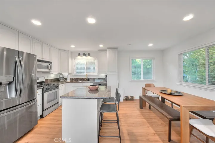 Inside, dramatic prow-style architecture, soaring beamed ceilings, and expansive windows fill the home with natural light and serene tree-top views. Fresh interior and exterior paint, a new front door, and updated windows throughout create a clean, contemporary feel. The remodeled open-concept kitchen flows into a bright living area with a cozy fireplace and forest backdrop.
