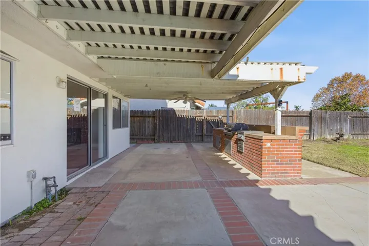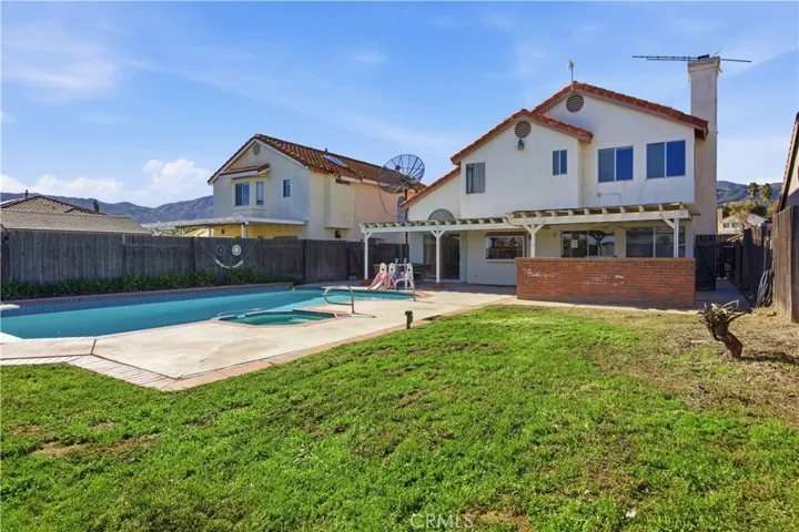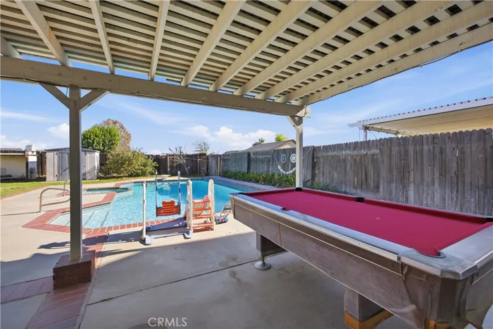 Walk through the sliding glass door from the family room, you are greeted by a very large sized covered patio structure with ceiling fan, a sparkling pool, BBQ area with sink to entertain large crowd on the weekends and to enjoy pool party on summer days with outdoor misting system to cool the entire patio area. Enjoy breathtaking view of the Mountain from the Front and Back of the home. Some Fruit Trees are in the backyard and front yard of the Home.
