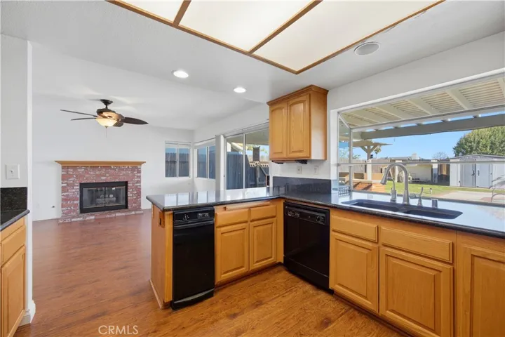The open floor plan boasts vaulted ceilings throughout the living and dining area. The spacious family room, complete with fireplace, flows seamlessly into a generously sized area, ideal for family gatherings.