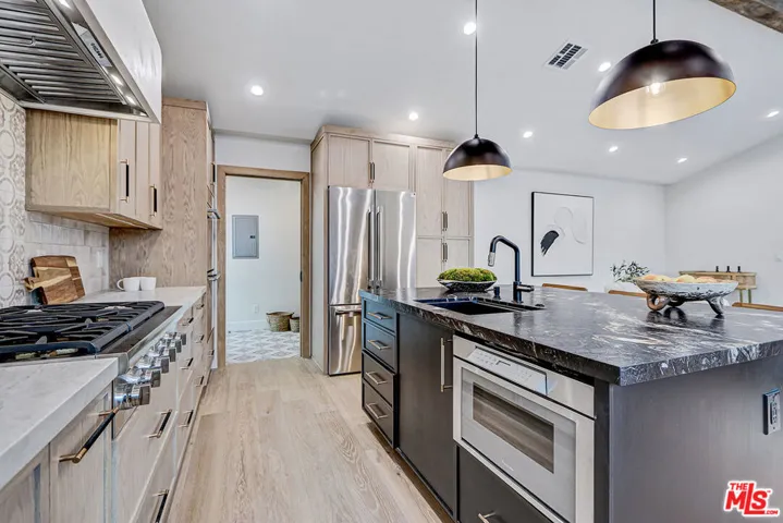 Extensively reimagined single-family residence with detached ADU, offering a flexible layout and cohesive design throughout. The home blends the feel of new construction with the character of an established neighborhood, featuring updated systems and refined finishes that create an easy transition for its next owner.A welcoming living room with fireplace opens into the main living areas, while a front enclosed patio adds additional usable space. Interior finishes include wood floors throughout, Milgard windows, pre-wiring for speakers, Ring doorbell, and security cameras.The kitchen is designed for everyday use and gathering, with a farmhouse aesthetic, breakfast bar, two sinks, six-burner cooktop with pot filler, farmhouse sink, Thermador double convection ovens with remote diagnostics and voice control, microwave, and Thermador French-door refrigerator.A dedicated laundry room includes a sink, built-in cabinetry, and space for a stackable washer/dryer.The primary suite offers generous proportions, a walk-in closet, an oversized shower with rain head, standalone soaking tub, and double vanity with seated vanity area.Outdoor spaces include rear deck suitable for dining or relaxing, herb garden, orange trees and full grass yard.The detached ADU provides additional flexibility with a custom walk-in closet, sliding doors with side patio access, Frigidaire appliances, and a bathroom with tub/shower combination.Offered as-is.