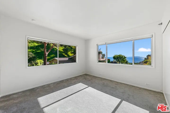 Tucked away at the top of a secluded cul-de-sac, this beautifully renovated home offers ocean and mountain views in a peaceful, private setting. The home sustained minimal fire damage and had since been thoughtfully remodeled and landscaped. Natural light fills every room, with windows and sliding doors opening to views of the ocean, pool, and greenery. The newly designed kitchen features modern fixtures, new cabinetry, stainless steel LG appliances, and direct access to the backyard. It is ideal for everyday living or hosting small gatherings. A main-level office (or guest room) with direct access to the patio and pool, providing flexibility for remote work or guest accommodations. Upstairs, the primary suite includes an en-suite bathroom, while two additional bedrooms share a spacious bathroom with double sinks, tub, and separate shower. Upstairs is newly carpeted, and all bedrooms are outfitted with blackout shades, creating calm, private spaces for rest and focus. Outdoor amenities include a newly resurfaced, heated pool with new equipment and safety fencing, a large patio for lounging and dining, a newly planted grassy backyard with lemon trees in the planters, and parklike hillside with mature trees and vegetation. Regular pool and gardener services are included in the rent and maintained by the owner, ensuring a low-maintenance lifestyle. Additional upgrades include a 200-amp electrical panel. Minimum lease term: 13 months. No short-term rentals.