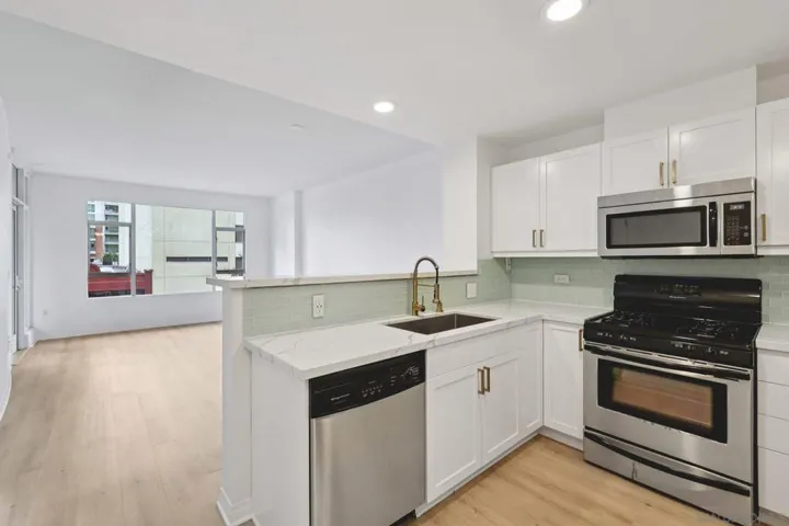 Light and bright, this spacious one-bedroom condo at Trellis on 5th offers the ultimate downtown lifestyle. The sleek, modern interior features a neutral color palette, open floor plan, and large picture windows that fill the space with natural light. The updated kitchen boasts quartz countertops, a glass tile backsplash, breakfast bar seating, and stainless steel appliances—perfect for entertaining. The bedroom accommodates a king-size bed and includes ample closet space, and a large updated bathroom with dual access. Additional highlights include in-unit laundry and one secure parking space. Residents enjoy resort-style amenities such as a 24-hour fitness center, BBQ courtyard, parcel lockers, and nightly on-site security. Ideally located in the East Village/Gaslamp district, you’ll have easy access to restaurants, cafés, nightlife, Petco Park, the Rady Shell, and scenic harbor walks—perfect for those seeking a vibrant urban lifestyle or a stylish pied-à-terre.