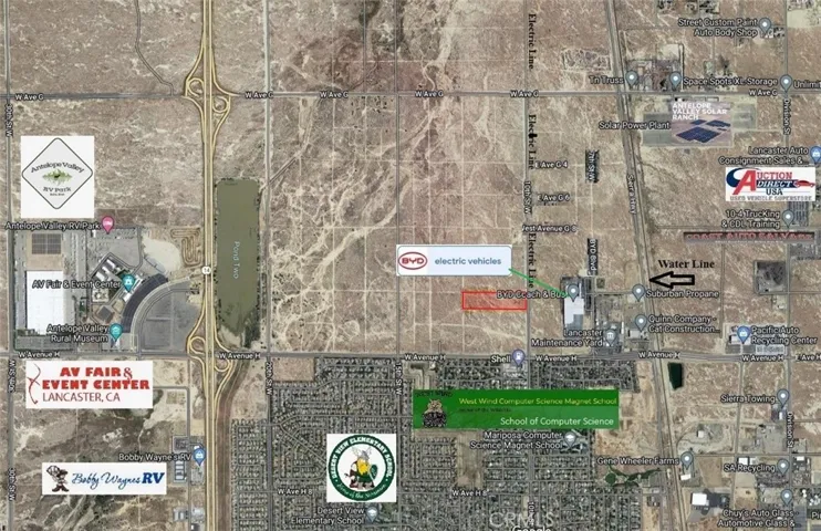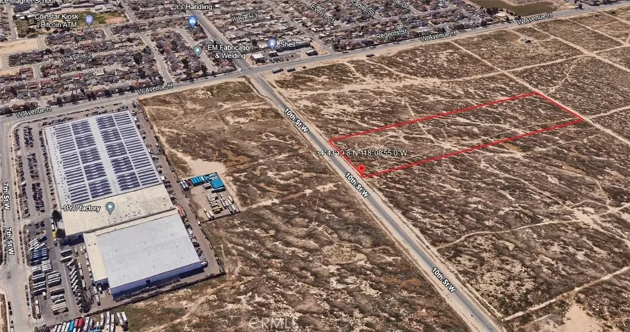 For sale or lease is a 9.85+- acres of light industrial property with 320+- feet of paved road frontage on 10th St W. Electricity, water, and sewer is on front of the property on 10th St W. The potential of this property is astronomical. Some of the commercial uses in the industrial zone areas are but not limited to: Aircraft-Related Uses, Automobile boat, vehicle, tractor dealerships, body repair, building trades, communication facilities, food manufacturing and storage facilities, general manufacturing, high technology research and development, warehousing and storage, emergency shelters etc. Please see the zoning document or the broker can send you a copy of the allowed uses in the light industrial area. This is also near major employers in the Antelope Valley such as NASA, Boeing McDonnell Douglas, Virgin Galactic, Mojave Air and Space Port, Lockheed Martin, Northrop Grumman, BAE Systems, EM Aero Space, Palmdale Regional, BYD Electric Bus Terminal, AV Fair Event Center, the Antelope Valley College, West Wind Computer Science Magnet School, etc.
