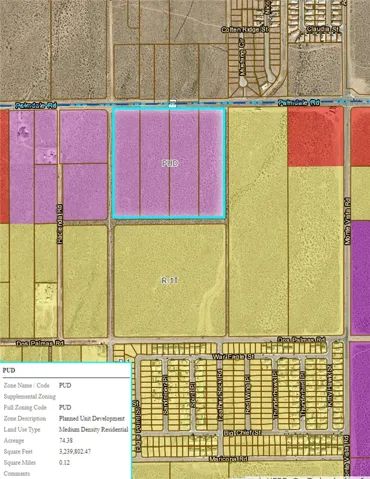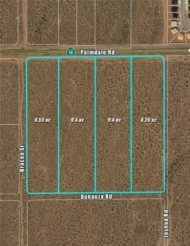 35.61 ac PUD (Planned Unit Development) land located at the Southeast corner of Palmdale Rd/Hwy 18 and Braceo St in the City of Victorville. PUD is designated for Medium Density Residential, allowing 12-20 units per acre. Listing consists of four parcels, bordered by Palmdale Rd (Hwy 18), Braceo St, Bonanza Rd and Joshua Rd. Pacific Communities and KB Home are currently building around the corner off Monte Vista Rd. Multiple Tentative and Final Maps being processed in the area, prepping this section of West Victorville for strong future growth. Easy access to Hwy 395 and I-15 to the East and a short distance from Hwy 138 to the West. There is a big need for multi-family development in the High Desert, and this property provides a good location, close proximity to local shopping needs and inclusion in a great school district (Snowline).