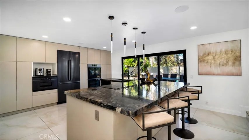 Welcome to your dream home! Nestled on a generous 13,000+ sq ft lot, this open concept residence with a pool & spa offers a rare combination of spacious luxury, modern upgrades, and resort-style living. Featuring 4 bedrooms—including two expansive master suites—and 3.5 beautifully updated bathrooms, this home is thoughtfully designed to accommodate both families and entertainers alike. Upon entry, you are greeted by white marble flooring throughout the main level, a striking black marble TV wall with a built-in electric fireplace that adds contemporary elegance to the main living space. Step inside a chef’s dream kitchen boasting high-end Dacor appliances, push-to-open custom cabinets with pull-out drawers, accent lighting, and an extra-large quartz stone island, providing both style and function. Enjoy additional luxury touches including a modern wine bar under the staircase, water-resistant laminate upstairs, and recessed ceiling lights that create a bright and welcoming ambiance in every corner of this home. The oversized glass sliding doors lead to your private backyard oasis, complete with lush tropical landscaping, swaying palm trees, a spacious swimming pool with a tranquil waterfall, and a relaxing jacuzzi. The expansive yard offers incredible versatility, with ample room to add a pickleball court, basketball court, or even build an ADU—ideal for multigenerational living or investment purposes.The front yard is fully remodeled with brand new turf, decorative white stones, and a water feature, ensuring beautiful curb appeal year-round. Don’t miss this rare opportunity to own a modern, resort-style home with endless potential!