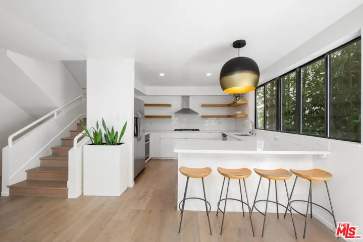 Imagine stepping into a modern sanctuary where expansive spaces and natural light converge effortlessly. This home boasts soaring ceilings that create an immediate sense of openness and airiness, complemented by large, strategically placed windows that flood the interior with sunlight. Beautiful hardwood floors in a light finish add a touch of warmth and elegance to the space, while highlighting a palette of light, neutral colors that amplify the brightness throughout. Welcome to Unit #5, a blend of contemporary elegance and modern design nestled in the heart of Westwood. One of only five meticulously remodeled townhomes in the prestigious William Hefner-designed condo, this residence offers a unique opportunity to experience high-end living in a serene cul-de-sac setting. As you step into the lower entry level, you’re greeted by a hallway that takes you to the fully renovated spacious master bedroom with a cozy fireplace, a private balcony, and an expansive walk-in closet. This level also features large bathroom with dual vanities, a separate shower, and a tubperfect for unwinding after a long day. The main level features an airy living room, where soaring ceilings and abundant natural light create an inviting atmosphere. This area, featuring an elegant fireplace, seamlessly extends to a private balcony, ideal for morning coffee or evening relaxation. The newly renovated kitchen is a chef’s dream, boasting state-of-the-art stainless-steel appliances and sleek finishes. Ascend to the upper level, and you’ll find a stunning secondo bedroom. This space has been transformed with a spectacular 20-foot-long, soundproof sliding window that overlooks the living room, providing a sense of openness and grandeur. The ensuite bathroom and generous closet space offer both convenience and luxury. This versatile room, perfect as a bedroom or home office, also opens to a private enclosed rooftop deck, creating a serene and peaceful retreat. Additional features of this exceptional home include private inside laundry, Nest system and Philips Hue lighting system (all configurable via mobile app), 2-car tandem parking, EV charging and private storage in the garage. Strategically located in Westwood, this building offers easy freeway access and proximity to UCLA, Westwood Village, and all the amenities of the Westside. Essential shopping at Bristol Farms, 99 Ranch Market, and Starbucks is just a short distance away.