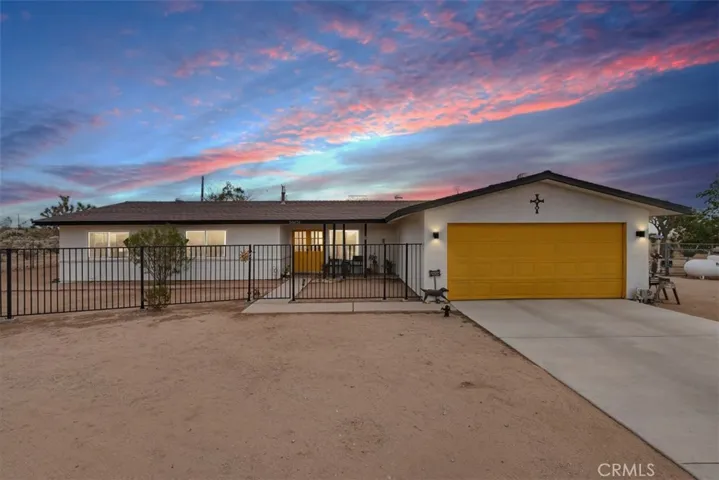 Dreamy desert oasis located on 1.25 acres in Yucca Valley! **ACTIVE SHORT TERM RENTAL WITH PERMIT** This gorgeous home is just 10 minutes from Joshua Tree National Park & minutes from restaurants, shops, and entertainment! The home is remodeled and move-in ready with newer HVAC, Energy star rated windows, porcelain tile flooring and more! The expansive lot offers endless possibilities with a large covered patio, spacious shed, and a reliable Generac backup generator, so you’re always prepared! Step inside through double doors to an open living room, complete with cozy fireplace. The remodeled kitchen features elegant quartz countertops, recessed lighting, brand new stove, and ample cabinetry. Upgraded porcelain tile floors continue throughout the home, extending to the generously sized bedrooms with expansive desert views from each room. The spacious primary bedroom offers two closets and an ensuite bathroom with a newly tiled shower and tub. The hallway bath has also been updated with an accessible walk-in shower. Enjoy privacy and natural beauty with two mulberry trees, several iconic Joshua trees, and a solar-powered motorized gate completing the serene surroundings. Furniture negotiable!**