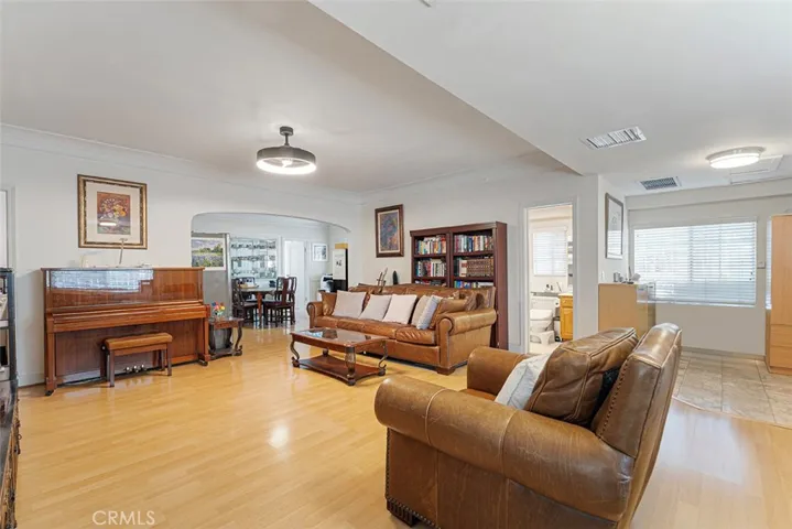 Inside, sun-drenched interiors feature wood-style flooring and a soft, neutral palette that creates a warm and sophisticated ambiance. A refined mid-century modern aesthetic flows throughout the property, offering a sense of calm, style, and seamless continuity. The spacious living areas are well-suited for casual mornings, family meals, or intimate gatherings, while generously sized rooms provide comfort and versatility. The den easily adapts as a home office, playroom, or guest space.