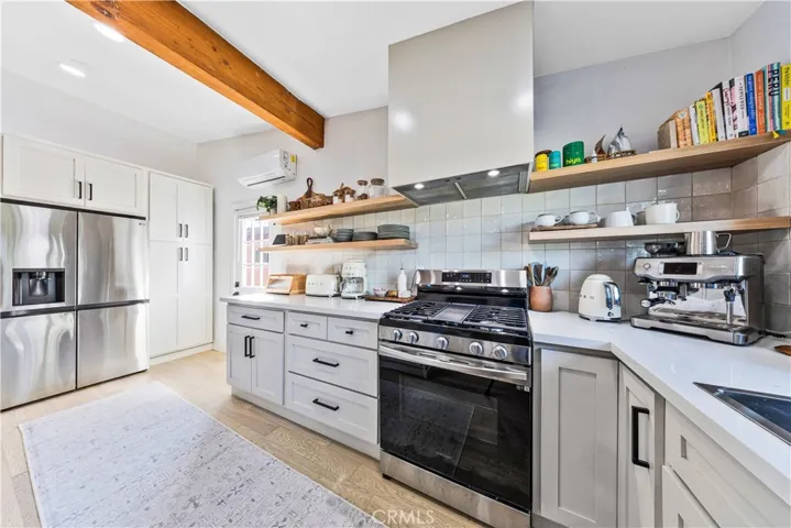 The bright, redesigned kitchen is ideal for everyday living and entertaining, showcasing custom maple wood cabinetry, smart storage with pull-out drawers and a built-in lazy Susan, white oak floating shelves, all-new hardware, and brand-new appliances.