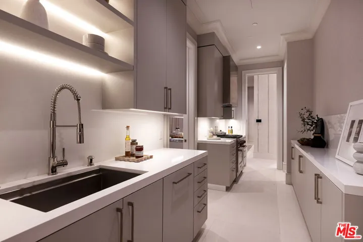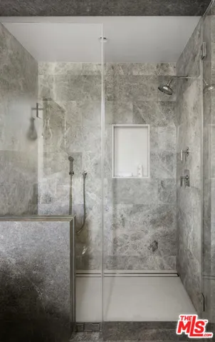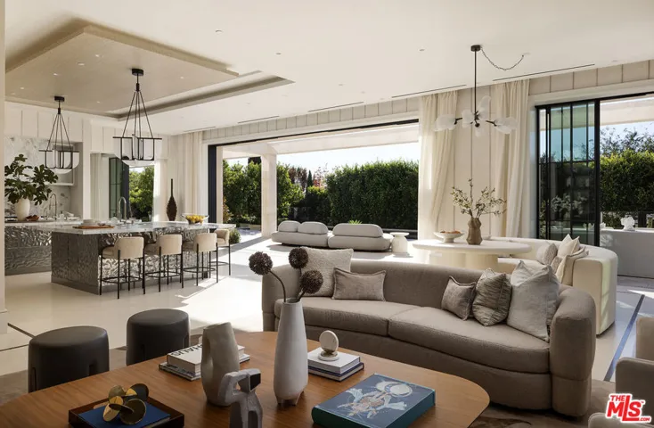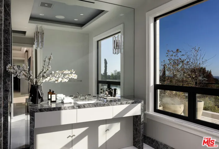 Envisioned by architect to the stars Philip Vertoch and crafted alongside award-winning, AD100-named design studio Ingrao Inc, The Bonhill represents a masterclass in blending architectural precision with timeless style. Concealed behind privacy gates with mature hedges lining its perimeter, this immaculate ocean-view estate includes multiple outdoor terraces offering spectacular panoramas, a sprawling grassy lawn, and premier amenities composed of fine materials. An impressive foyer provides a sense of continuous space with its floating limestone staircase as centerpiece, each step repeating in soft, rhythmic progression. An elegant dual-sided Cristallo marble fireplace partitions the formal living room and nearby parlor with stylish marble wet bar as soothing breezes waft through paned French and pocket doors. The true marvel of the home is its culinary center, a fusion of Farmhouse and transitional forms, a blissful yet understated display of calming hues and varied texture, optimized for casual indoor-outdoor living and entertaining. There are two center islands, custom-fitted designer cabinetry, wine refrigeration, chef-grade Gaggenau and Sub-Zero appliances, and preparation kitchen. Both the formal dining room and the library are nods to traditional, classic style. Upstairs, the owner’s suite opens to a vast patio with incredible views of the Pacific, Catalina Island, treetops, mountains, and urban sprawl. Its sleek, spa-inspired bath includes a soaking tub, oversized shower, makeup desk, toilet room, and dual-sink vanity. There are also two walk-in closets and a secondary en-suite marble-clad bath. From the spacious rooftop deck, serve party guests, barbecue and serve light bites, and recline with fantastic vistas as backdrop. For lazy mornings and warm afternoons, a pajama room transitions to a sunny travertine balcony surrounded by lush greenery, reminiscent of summers abroad. Standout luxe amenities include a state-of-the-art gym, theatre with refreshment bar, art gallery, wine tasting/cigar lounge, and wellness spa with steam shower, massage room, and dry sauna. An elevator connects all levels. Outside, lounge poolside under open-air verandas and meditate in peaceful gardens. The pool includes a baja shelf and accompanying cabana with bar and shower. The long pebble driveway leads to a finished subterranean garage affording parking for eight vehicles, bringing the grounds’ total capacity to 17 or more. Relish an idyllic, peaceful existence positioned in Brentwood’s Bonhill-Tigertail estates section, one of the world’s most sought-after, celebrity locales.