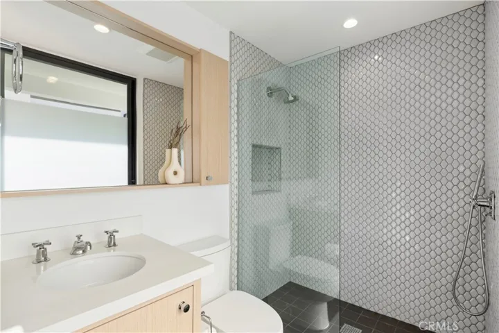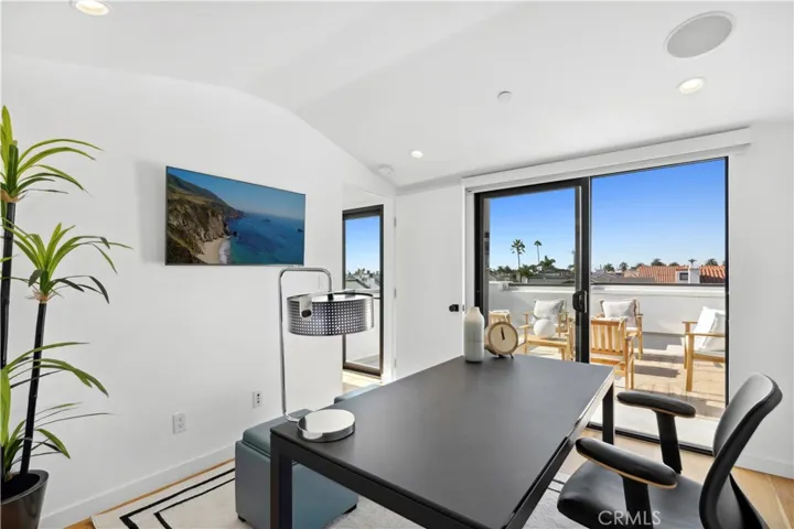 The primary suite features a private terrace and a spa inspired bath with an oversized glass shower. Above, the rooftop deck offers a quiet place to relax, with peek a boo Catalina views and coastal sunsets.