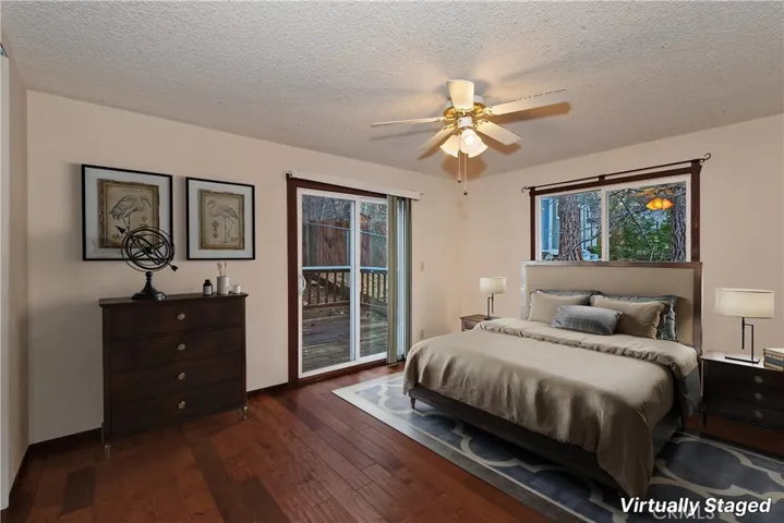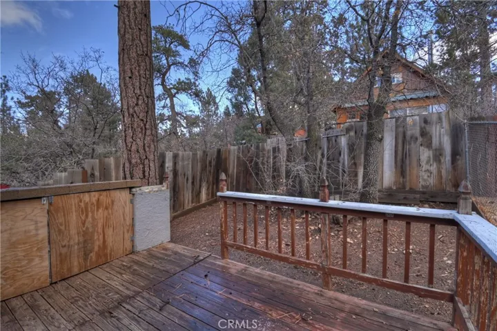 Chalet style home located in Sugarloaf ~ This reverse floor plan features 2 bedrooms and 1.5 bathrooms ~ A mud room, one bedroom, a half-bathroom with laundry hookups, and a large closet are on the entry level ~ The other bedroom with large closet is upstairs, alongside the main living area, and the full bathroom ~ The living room, kitchen, and dining area on the second level are an open space to gather, and have laminate flooring, an inviting rock fireplace, T&G ceilings, and an abundance of natural light ~ Enjoy outdoor living on two decks, with one in the front, and one in the rear with a storage area, ideal for relaxing or entertaining ~ The yard is partially fenced ~ Situated near hiking trails and the National Forest, with convenient access to Big Bear Lake, ski resorts, and local amenities.