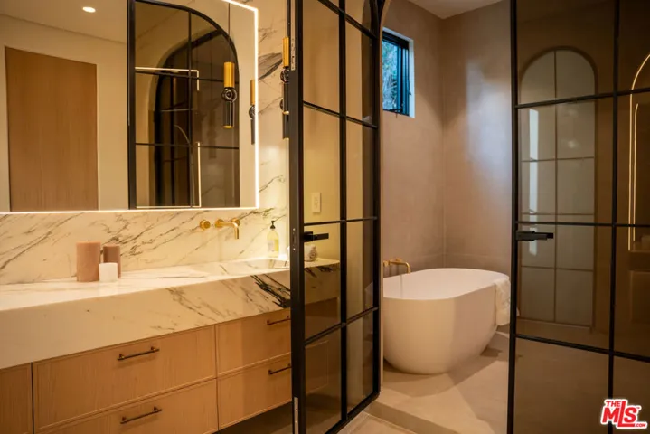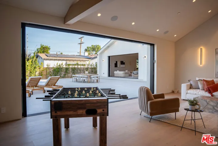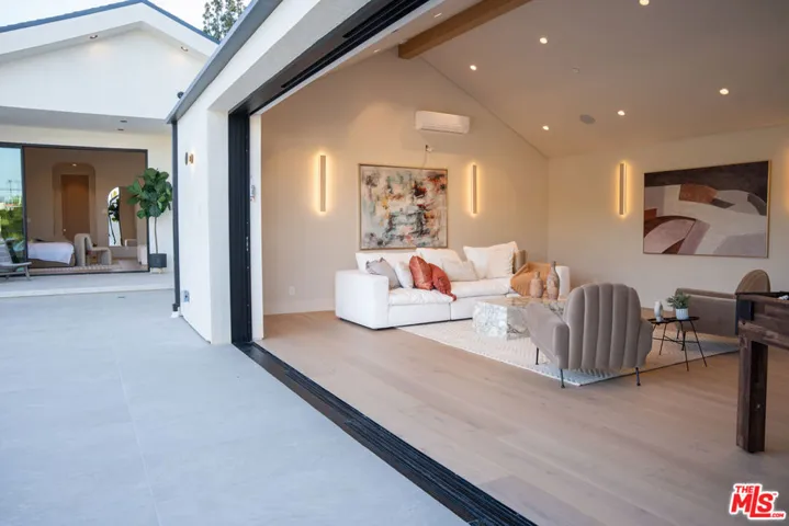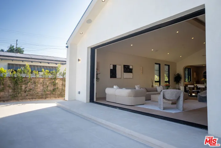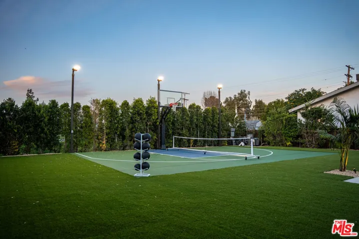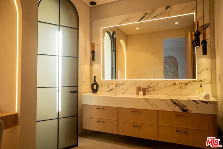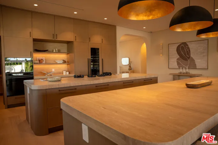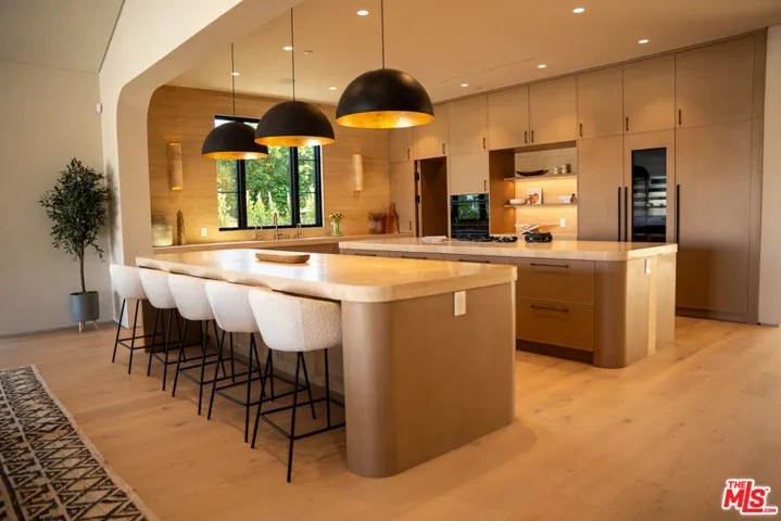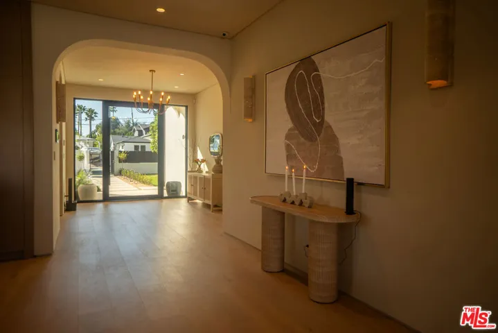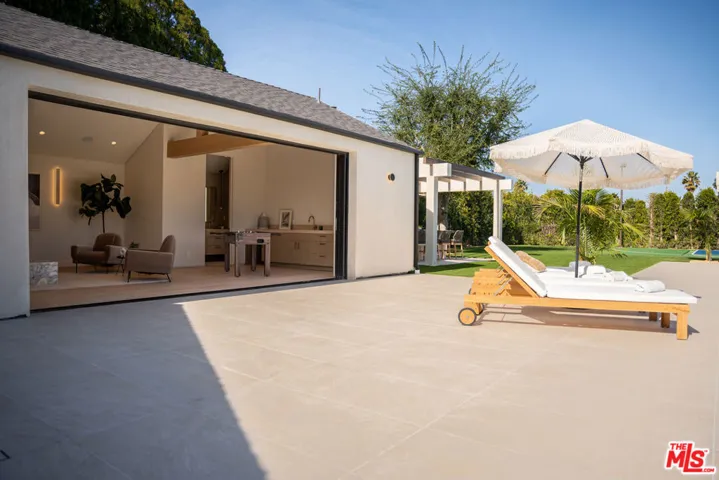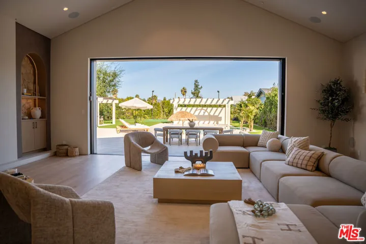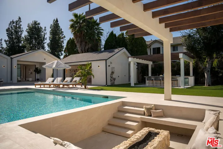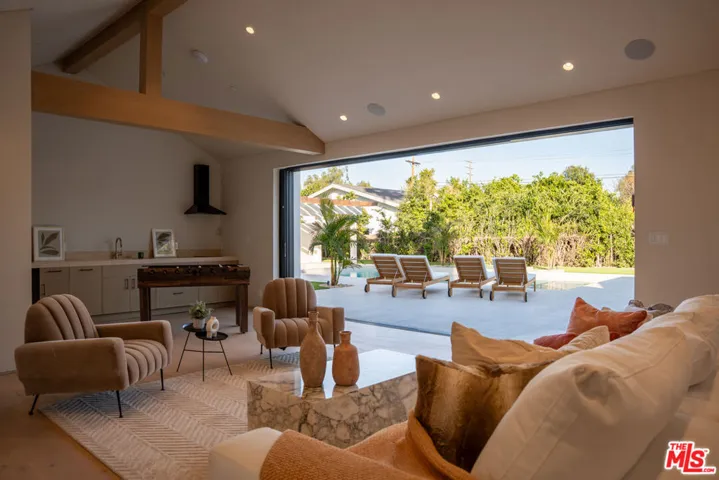 Elevated single-level resort-style residence showcasing warm natural textures and refined modern design. A soft neutral palette, custom millwork, arched architectural details, stone finishes, and wide-plank wood flooring create a cohesive, magazine-worthy aesthetic throughout. The open-concept layout is filled with natural light and highlighted by vaulted ceilings with exposed beams and seamless sightlines to the outdoor living spaces.At the heart of the home is a designer statement kitchen featuring an oversized island with seating, integrated cabinetry, sculptural pendant lighting, and a dramatic stovetop feature wall wrapped in custom stone with a sleek vent hoodcreating a striking focal point that blends form and function.The 4,000 sq. ft. main residence offers four bedrooms and four and a half bathrooms, including a luxurious primary suite designed as a private retreat. The spa-inspired bath is finished with natural stone, soft ambient lighting, and refined fixtures, while dual walk-in closets complete the space. Secondary bedrooms and baths continue the home’s calming, elevated design.Situated on an approx. 18,000 sq. ft. lot, the backyard is a true resort-style oasis featuring a sparkling pool and spa with Baja shelf, a sunken conversation fire pit lounge, expansive entertaining patios, a sports court, and a 700 sq. ft. detached guest house with a private bathroomperfect for guests, a home office, or studio. Covered and open-air spaces create multiple zones for relaxing and entertaining, while large sliding glass doors provide seamless indoor-outdoor flow.An exceptional single-level home combining modern design, comfort, and resort-style amenities.