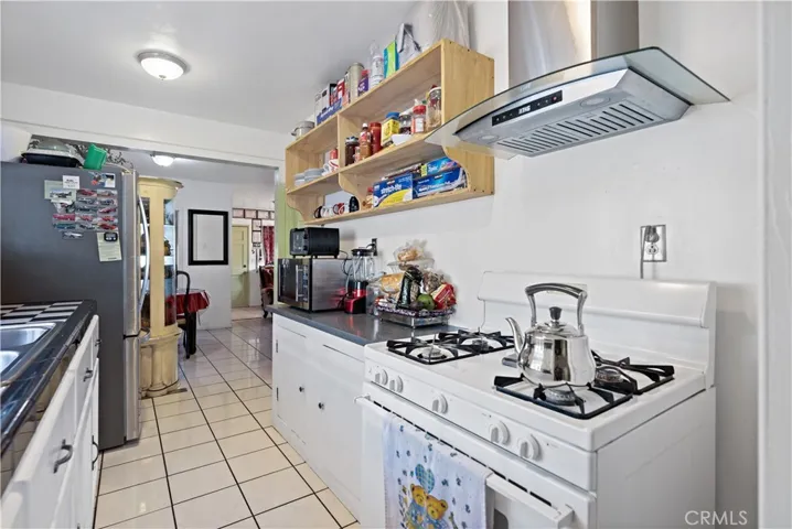 The kitchen includes tiled countertops, open shelving, and direct access to the dining area. An exterior laundry area is located just outside the home, providing washer and dryer hookups in a covered utility space. In addition to the main residence, the property includes a converted detached structure currently used as a fourth bedroom or bonus room, offering flexibility for additional living, workspace, or storage use (buyer to verify permits and intended use). The front yard is gated and includes a concrete patio/parking area, while the lot extends back from the street with separation between structures. The home qualifies for the Ladder Up grant program through City National Bank (buyer to verify eligibility and program terms). Convenient access to nearby shopping, dining, and regional transportation corridors.