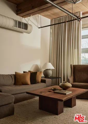 Exceptional Arts District loft in the historic Barker Block, exquisitely designed by noted interior design firm DISC Interiors. A dramatic wall of windows spans the far end of the residence, dressed in floor-to-ceiling drapery that adds warmth and texture, filling the space with an abundance of natural light and framing a coveted downtown skyline view. West-facing units with all wood ceilings and sunset exposures like this rarely come to market at Barker Block, making this residence an exceptional opportunity. This special home strikes a thoughtful balance of warmth and sophistication with hardwood floors throughout, nearly 11-foot ceilings with exposed beams, architectural lighting complemented by designer decorative fixtures, and custom built-in cabinetry providing ample storage at every turn for smart, elevated living. Warm white walls and painted-out ducting give the loft a more cohesive and softened feel. The heart of the loft is a chef’s kitchen outfitted with top-of-the-line, recently updated appliances seamlessly anchoring the open layout, ideal for both everyday life and entertaining. A spacious full bath includes in-unit laundry, while the generously sized bedroom features luxurious custom curtains that provide privacy and a thoughtful separation of space. The bedroom is complemented by a large wall of custom designed closets with antique brass hardware, and a built-in wall-to-wall oak dresser. A custom built-in 16′ desk with a full wall of bookshelves thoughtfully separates the entry and dining areas, adding both function and architectural interest.The Barker Block is a full-service building offering 24/7 front desk and security, complimentary common-area WiFi, an outdoor lounge with fire pits, and a resort-style rooftop with heated pool, spa, BBQ areas, and a fitness center showcasing some of the best panoramic views in downtown Los Angeles. Known for its striking architectural details and timeless industrial character, the live/work designated Barker Block also offers a dynamic and sophisticated creative community spirit.Located in the heart of the Arts District, moments from Bavel, Girl and the Goat, Verve Coffee, Blue Bottle Coffee, as well as walking distance to Still Life Ceramic Studios, Dover Street Market, Bestia, Soho Warehouse, and art galleries such as Hauser & Wirth, this exceptional loft delivers a rare blend of architectural pedigree, thoughtful design, and a vibrant, walkable urban lifestyle.