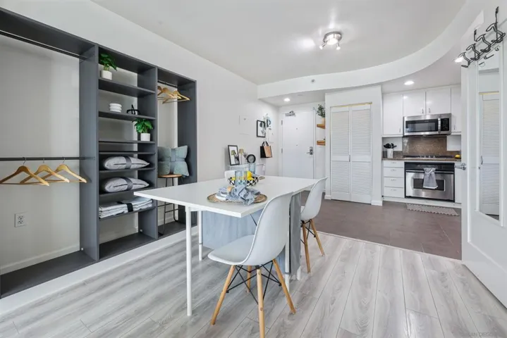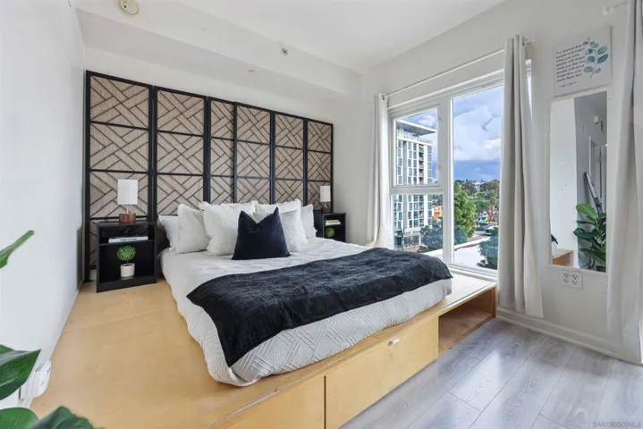 Welcome to this light-filled studio condo perched on a higher floor in the heart of San Diego’s East Village. Designed with an open and airy layout, the home is wrapped in floor-to-ceiling windows that flood the space with natural light and showcase sweeping views of downtown San Diego. Thoughtfully arranged, the layout allows for clearly defined zones for working, dining, and relaxing making the space feel both functional and expansive. The counter space is ideal for preparing meals, casual dining, or entertaining guests. The sleeping area is tucked into its own designated nook, offering a sense of privacy while still allowing you to wake up beside the windows and city views. Open the sliding glass doors and windows to enjoy a refreshing breeze and bring the outdoors in. The building enhances your lifestyle with beautifully landscaped common areas, including a cozy fire pit perfect for unwinding at the end of the day. Stay active without leaving home in the on-site fitness center, equipped with a variety of popular workout equipment. Convenience is key, with secure building access and an assigned parking space located just steps from the elevator, plus the unit itself is conveniently situated near the elevator for easy access. This condo offers the best of downtown living: close enough to enjoy San Diego’s vibrant dining, nightlife, and cultural scene, yet perfectly positioned away from the constant hustle and bustle. A truly well-rounded home that blends comfort, style, and location.