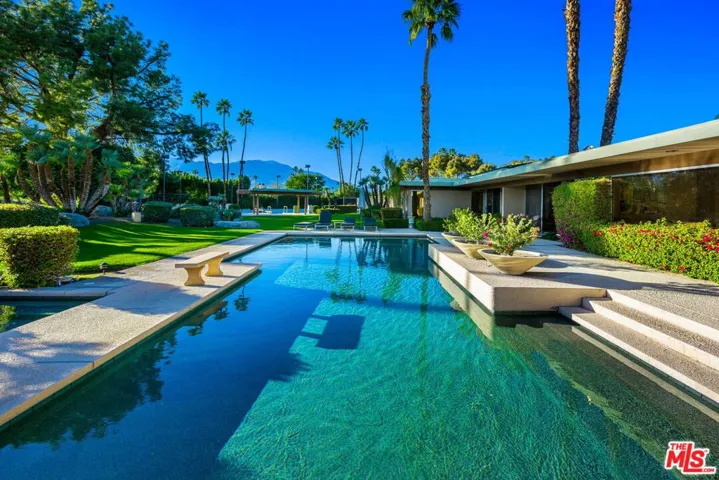 An Artful Masterpiece on the Fairway 13th hole. Discover a rare intersection of architectural pedigree and curated luxury. Designed by the legendary William Cody, this sprawling single-level retreat spans four parcels, offering over an acre of absolute privacy. From the moment you enter, you are greeted by floor-to-ceiling glass walls that frame the Santa Rosa Mountains. The heart of the home is a dramatic great room featuring a unique double-sided fireplace that connects the interior warmth to the desert night. Whether you are hosting cocktails at the five-seat wet bar or preparing a feast in the gourmet kitchen outfitted with black granite, dual islands, and professional-grade appliances, every detail serves a life of refinement. Oversized living room, formal dining room with sit down bar along with a unmatched family room for movie night and a late night lounge located in a separate wing of the estate. The estate is intelligently segmented into wings to balance social connection with total solitude: The East Wing: A sanctuary housing the primary suite with endless closets, dressing rooms, private den and dual bathrooms all with jaw dropping views, two additional bedrooms, and a private office all with direct patio access. The West Wing: A sophisticated enclave of two guest suites, one of which is the second primary, designed for flexible living or an interconnected private suite. The Casita: A fully self-contained residence featuring its own living area, kitchen, and two private suites along with a private entry. Outside, the experience is unrivaled. Enjoy a private tennis match with elevated viewing deck, a dip in the heated pool, or an al fresco dinner prepared in the outdoor kitchen as the sun sets over the greens.