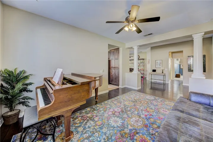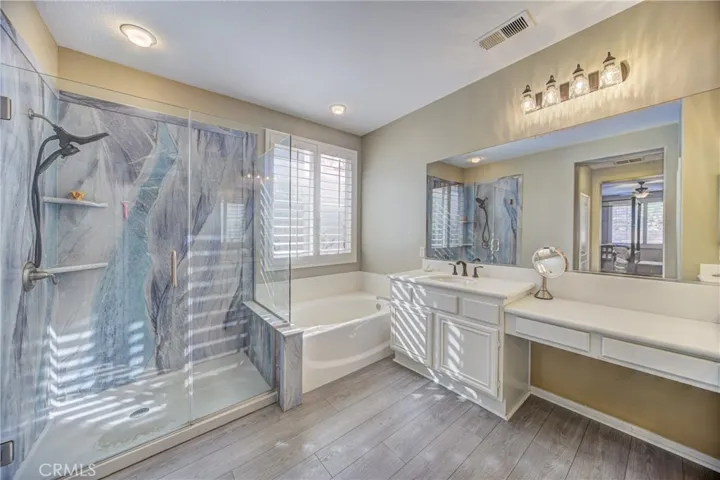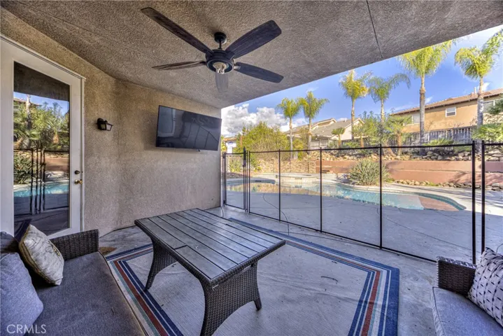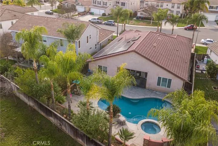 Highly desirable Menifee single-story home with pool, spa, and covered California room, built for easy indoor-outdoor living. There are 4 bedrooms and 3 bathrooms, with no HOA at the top of a cul-de-sac. The great room opens to the backyard entertainment area, and the dining room includes a slider to the pool patio. An additional living room/den adds flexible space for work or relaxation. The kitchen features tons of granite counter space and lots of cabinets as well as a large island. The kitchen opens to the large family room for easy entertainment and everyday living. The layout maximizes privacy with smartly separated bedroom wings—one bedroom and full bath in its own wing, two additional bedrooms in the opposite wing with a Jack-and-Jill bathroom, and the primary suite at the rear of the home overlooking the pool. The spacious primary bedroom features a ceiling fan and patio access. The ensuite bath includes a designer shower, dual sinks, walk-in closet, and modern finishes. Set at the top of a quiet cul-de-sac with no HOA, the low-maintenance backyard offers easy-care landscaping, a large pool and spa, and a shaded California room for comfort year-round. Additional highlights include a 2-car garage and solar panels for energy savings.