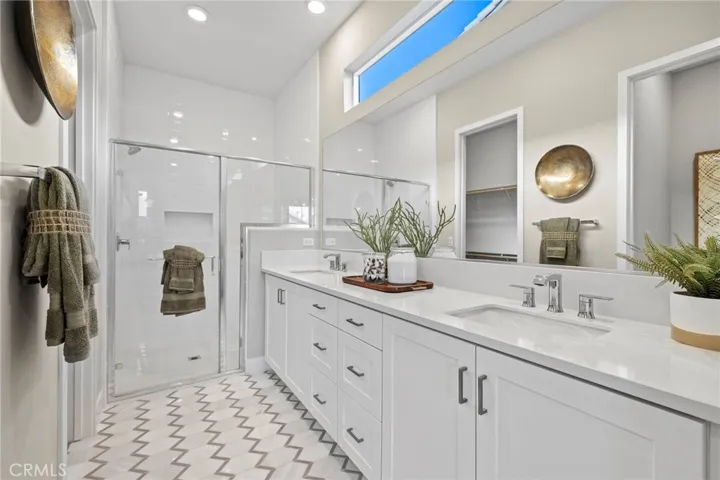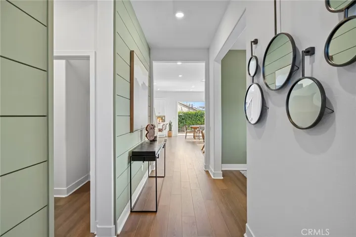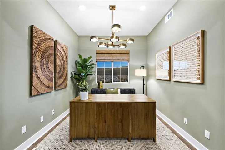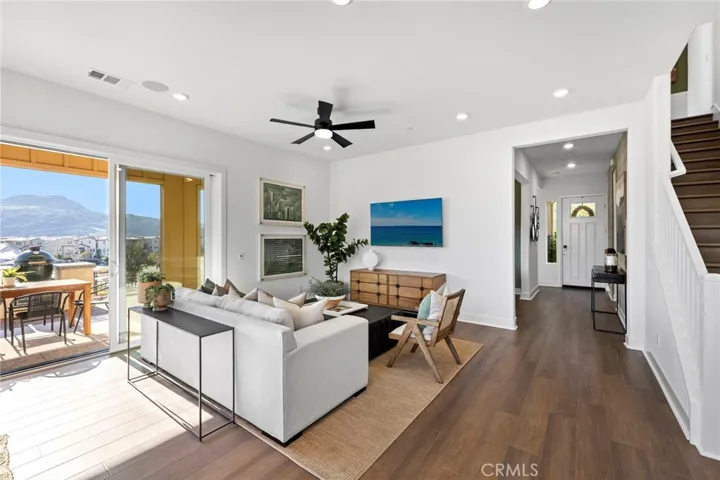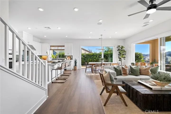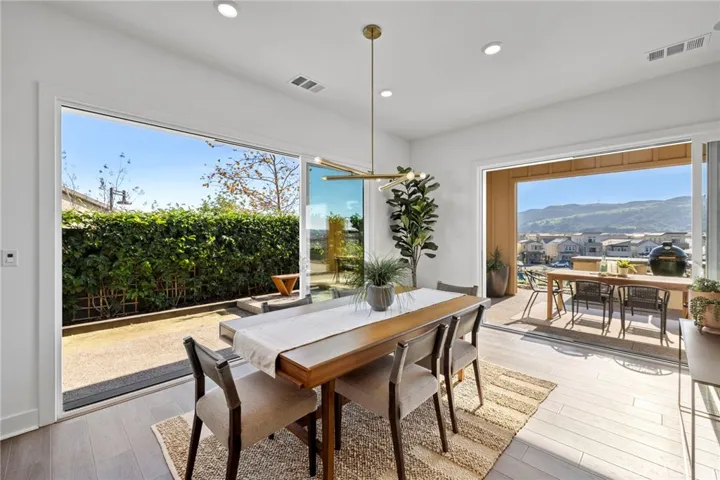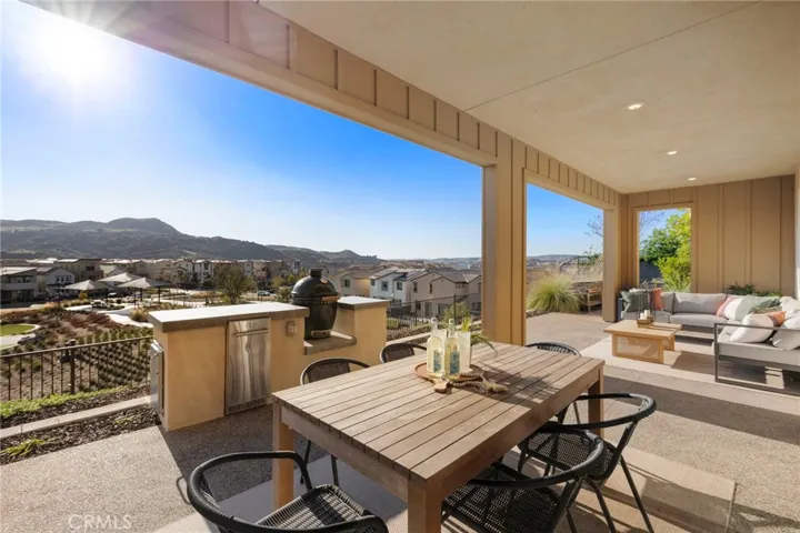 Perched on a hillside with panoramic views, this former Pearl Model Home impresses. Upon entry you are drawn in by the two walls of glass stacking doors opening to the stunning backyard with panoramic views of the hills and beyond. Rich wide plank luxury vinyl flooring flows throughout the main living spaces of this highly upgraded former model home. The kitchen features white cabinetry with soft close hinges, white quartz countertops, full tile backsplash and stainless steel appliances—including a large built-in refrigerator and 6 burner stove. Two bedrooms, including the primary suite and secondary suite, office, laundry room and powder bath are all on the first floor—including an attached two-car garage with epoxy flooring plus an 8 panel Solar System. Just upstairs the second floor boasts a large bonus room with full bath which can be used as a third bedroom suite, gym or game room. The spacious primary suite with beautiful limestone tile focal wall and designer chandelier. It’s generous ensuite bath has a dual sink vanity, walk-in shower with glass enclosure and bench seat and a large walk-in closet. Office with custom paint and a modern oversized brass ceiling light for a curated look. Guests will be welcomed with upgraded carpeting, a stylish wallpapered accent wall and striking gold chandelier. Plus the ensuite bath with single sink vanity and tub/shower combination makes it a luxurious space for guests. Upstairs is a oversized bonus room with wrap around windows that share the same stunning views as the backyard. With an ensuite full bath and wall of closets, this space is full of options. The home’s backyard is the star of the show! On a corner lot offering maximum privacy with only one neighbor the side and unobstructed views of open space and mountains beyond. A combination of hardscape pavers, turf and mature landscaping with ambient lighting make it a comfortable space to spend time outdoors day or night. The large covered patio with recessed lighting nearly spans the entire length of the back of the home and the wrap around yard includes a bocce ball court. A built-in BBQ bar has a Green Egg smoker and stainless steel refrigerator —convenient for outdoor entertaining. Steps from the home is the Perch 55+ Pool complex plus you have access to all of the amenities that both Gavilan and Rancho Mission Viejo have to offer which include ten community pools and clubhouses, tennis and pickleball courts, walking trails, coffee shop, gyms and more.