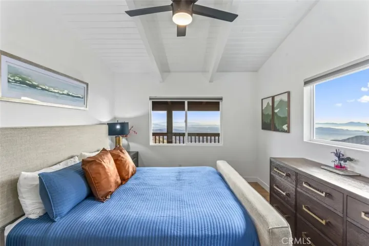 The primary suite offers vaulted ceilings, expansive windows, a walk-in closet, and a spa-inspired bath with a custom tiled walk-in shower, floating bench, and elevated finishes. The guest bedroom features high ceilings and ample storage, while the guest bath includes a deep soaking tub.
