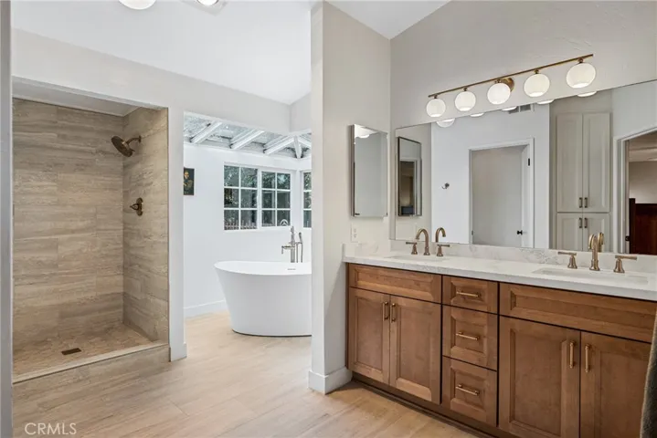 Beautifully renovated 3-bedroom, 3-bathroom home offering 2,370 square feet of thoughtfully upgraded living space on a private and fully usable 1.1-acre lot with a swimming pool, mature landscaping, and an expansive orchard. This turnkey property combines modern upgrades, luxury finishes, and indoor-outdoor living, making it ideal for those seeking space, privacy, and move-in-ready condition. The interior features wide-plank engineered hardwood flooring throughout the main living areas, new designer lighting, solid-core interior and closet doors, upgraded hardware, and custom drapery in the main living spaces and primary bedroom. Bedrooms feature new stain- and water-resistant carpet, offering durability and comfort. The upgraded kitchen includes KitchenAid appliances, custom soft-close cabinetry, and quartz countertops, providing a clean, functional space for cooking and entertaining. Bathrooms have been remodeled with high-end finishes. The primary bathroom features porcelain tile, a luxurious soaker tub, quartz countertops, custom soft-close cabinetry, updated plumbing fixtures, and modern lighting. The secondary bathroom has also been remodeled with new cabinetry, tile, mirror, lighting, toilet, and plumbing fixtures, creating a cohesive and updated feel throughout the home. Major system upgrades include a new roof, new fascia, new electrical panel, new water heater, new chimney cap, fresh exterior paint, and a new variable-speed pool pump. The entire 1.1-acre property has been professionally cleared and fire-abated, including removal of underbrush and trees near the home, enhancing safety, usability, and peace of mind. Outdoor living is highlighted by a private pool, open space, and a productive orchard serviced by a smart drip irrigation system controllable by phone. Mature fruit trees include navel and Valencia oranges, tangerine, tangelo, mandarin oranges, pink grapefruit, cocktail grapefruit, yellow grapefruit, kumquat, lemon, lime, pear, plum, and peach. Additional landscaping includes lavender and olive bushes, completing this peaceful and private setting. This exceptional property offers a rare combination of acreage, pool, extensive upgrades, fruit trees, and turnkey condition, ideal for those seeking a private estate, entertainer’s home, or retreat-style living.