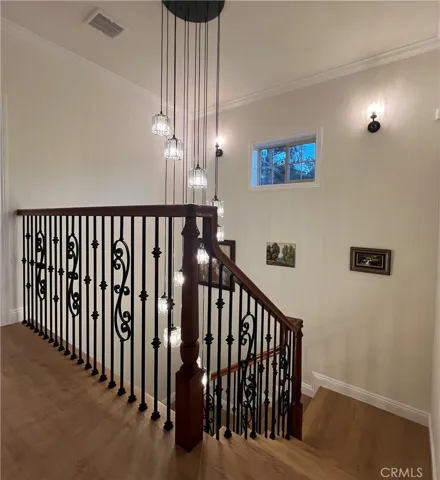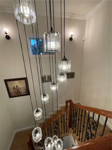 Modern cluster pendants echo the spiral staircase, leading to the luxurious master bedroom and two spacious bedrooms.