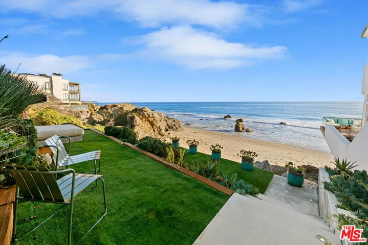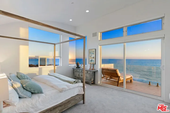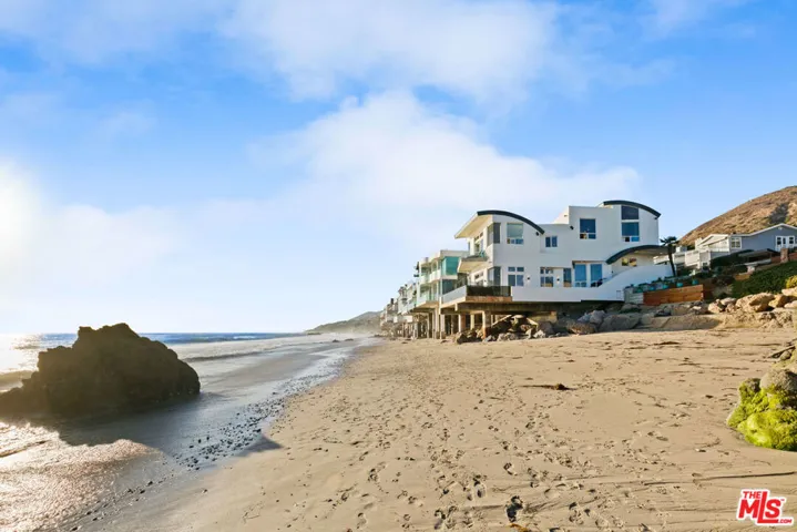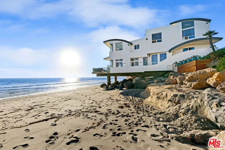 Welcome to this uniquely located seaside escape, a warmly crafted architectural residence situated in a private, gated enclave in the highly coveted Broad Beach neighborhood. This oceanfront retreat captures mesmerizing ocean views from nearly every room. Nestled on two premier beachfront parcels, the property features an impressive 60 feet of pristine ocean front. This custom home was designed 25 years ago by the esteemed Barsocchini & Associates for the current owner. This unique Malibu gem is currently being offered for long term lease. Located in the prestigious Sea Level Drive enclave, the home enjoys exceptional privacy and unobstructed views of dramatic rock formations and twinkling city lights, thanks to its prime position between two development-restricted lots. Architectural highlights include a distinctive Wave Motif copper-clad roof, artisanal art glass windows, bespoke iron railings, and inviting stone bathrooms. The welcoming interiors are characterized by soaring ceilings, expansive picture windows that bathe the rooms in natural light, and charming finishes, creating a harmonious blend of comfort and style. The bright living and dining areas on the main floor open onto a spacious wraparound deck, ideal for al fresco dining, barbecues, and relaxation by the sea. The gourmet kitchen, with its vaulted ceiling, custom cabinetry, bar seating, breakfast nook is a chef’s delight. A stairway from the kitchen leads to an outdoor shower and the sandy beach. The main level also includes a bedroom and a full bath, while the lower level features a vast media/recreation room with a fireplace, laundry room, and bath. The upper floor houses three en-suite bedrooms, including the breathtaking ocean-view primary suite. This retreat features two walk-in closets, extensive built-ins, an oceanfront balcony, a spa-inspired bathroom with ocean views. Situated down the hallway lies a stylish library lounge, ideal for zoom calls, reading and relaxing. The adjacent lot provides a terraced outdoor sanctuary for entertaining and soaking in the sound of the breaking surf. The striking rock formations to the east are a source of constant visual delight. A surfer’s hideaway for locals is a paddle away. The property includes a two-car garage and additional parking for four vehicles in the driveway. With its superbly executed design and one of a kind beachfront location, this residence invites you, your family and friends to indulge and enjoy the luxury of the Malibu beach lifestyle.