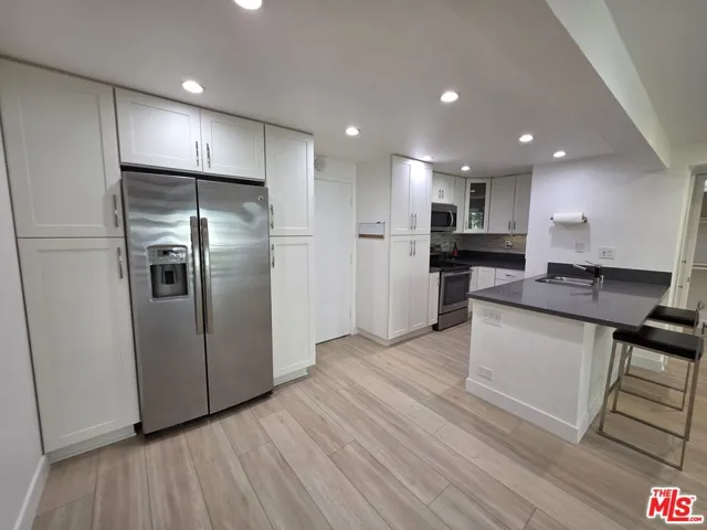 Wake up above the treetops in this fully renovated modern loft style condo that feels more like a boutique retreat than a typical Westwood rental. Set on the quiet top floor of the sought after Colony building, this home offers soaring vaulted ceilings, leafy neighborhood views, and glimpses of the Wilshire Corridor that glow in the evenings. Mornings begin in a serene resort setting with winding paths, waterfalls, koi ponds, and shaded lounge areas, while your day is supported by 24 hour security, on site management, package service, and a spa like fitness center with gym, steam room, and sauna. Inside, the expanded contemporary kitchen anchors the space with white shaker cabinetry, generous pantry storage, quartz countertops, and stainless steel appliances, opening effortlessly to the living area for relaxed dinners or entertaining friends. A brand new straight staircase leads to an airy open loft with a skylight and an oversized attached storage room, creating a flexible retreat for a home office or bedroom lounge. Downstairs, the private primary bedroom offers a calm escape with a tiled en suite bath featuring a shower over tub, thoughtfully separated from the loft for added privacy. New white oak look luxury vinyl plank flooring runs throughout, complemented by a new Milgard double paned bedroom window and sliding glass door that opens to a peaceful patio overlooking Kelton Street, framed by treetops and city views. With secured parking, EV charging, and utilities including electricity, water, and trash included, daily life feels effortless. Just across the street, a large park with tennis and basketball courts and a dog park adds to the lifestyle, while UCLA, Westwood Village, and the upcoming Purple Line station are moments away. Available for immediate occupancy, this move in ready home offers a refined, relaxed Westwood lifestyle that is easy to imagine and even easier to enjoy.