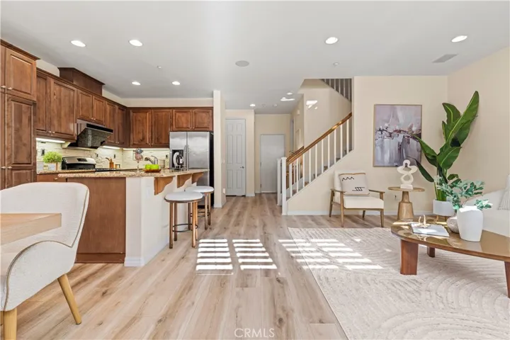 Step inside to a bright, open-concept main level featuring wide-plank flooring, recessed lighting, and plantation shutters that bring in beautiful natural light. The kitchen is anchored by a large granite island, stainless steel appliances, rich cabinetry, and a stylish backsplash—plus a newer Fotile range hood, a major upgrade for high-heat and aromatic cooking styles with strong ventilation. Sliding glass doors lead to a private, easy-care hardscaped backyard/patio, ideal for outdoor dining, pets, or simple weekend relaxation. The home also includes a convenient media wall setup ready for your TV and entertainment needs.