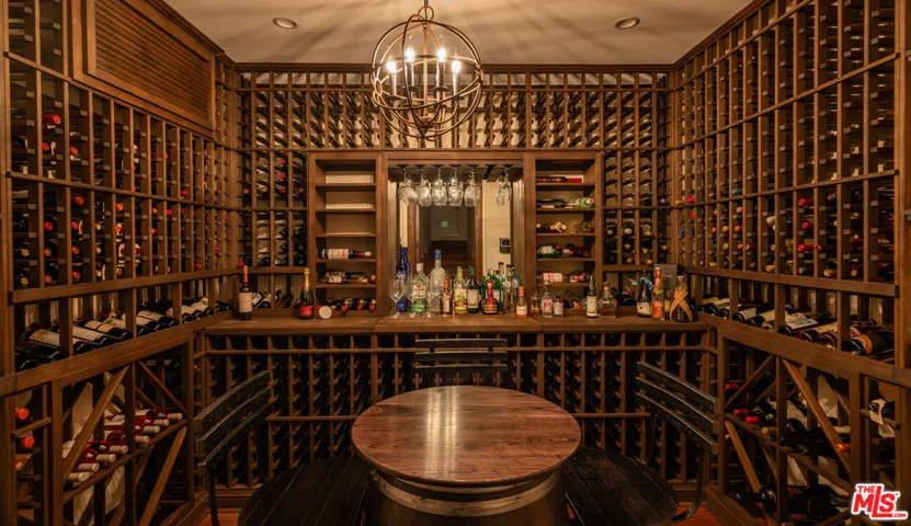 Steeped in Hollywood history and reimagined for contemporary living, this extraordinary 1928 estate was originally built by renowned Spanish Revival and Monterey Colonial architect Roy Seldon Price for Charlie Chaplin’s second wife, with interiors crafted by legendary set designer Harold Grieve. Today, the residence stands fully remodeled and thoughtfully upgraded, preserving its storied past while embracing the finest modern amenities. Tall, mature hedges encircle the property, ensuring complete privacy the moment you enter through the double-gated drive. A long motor court leads to the main entry, framed by a grassy lawn, fruit trees, and a charming turtle pond beside a dedicated dog run.Inside, the home unfolds through a striking foyer appointed with Moroccan tiles, grand archways, Spanish lighting, and bespoke French doors. This central hall opens to an elegant sequence of entertaining rooms, all bathed in natural light and designed with effortless indoor-outdoor flow. The formal living room features a dramatic stone fireplace and extends to both the expansive backyard and the front garden courtyard. The room also features a built-in bar and lounge area, along with a library/office with garden access. A vintage-style powder room and vanity complete the formal wing. At the heart of the home lies the chef’s kitchen, featuring Viking appliances, a walk-in pantry, generous central island, and breakfast bar. Set between the formal dining room and inviting family room showcasing coffered ceilings, bespoke wall treatments, stone fireplace, and a built-in banquette dining area – ideal for gatherings of any scale. Below, an incredible wine cellar and multiple storage rooms offer utility and temperature-controlled preservation.Upstairs, five bedrooms occupy the main level, three of which open to a wraparound balcony overlooking the gardens. The primary suite is a sanctuary unto itself, featuring a stone fireplace in the private sitting room, dual bathrooms with a soaking tub, generous walk-in closet, and private balcony with direct access to the pool terrace below. The family room opens through French doors to a covered terrace with views of the pool, spa, cold plunge, and a full outdoor kitchen and dining pavilion beneath iconic Beverly Hills palms. The backyard also boasts a spacious lawn with a detached one bedroom/bathroom pool house. A completely separate wing is accessed through the gated side driveway and two-car garage – perfect for guests or staff. This private suite includes a secondary office with its own bathroom, a fully outfitted mirrored gym, a dedicated laundry area, and two bedrooms with a shared bath and direct access to the backyard. An additional large laundry room sits adjacent for convenience.A rare, meticulously maintained estate in the Beverly Hills Flats – steps from the area’s premier shopping, dining, and nightlife.