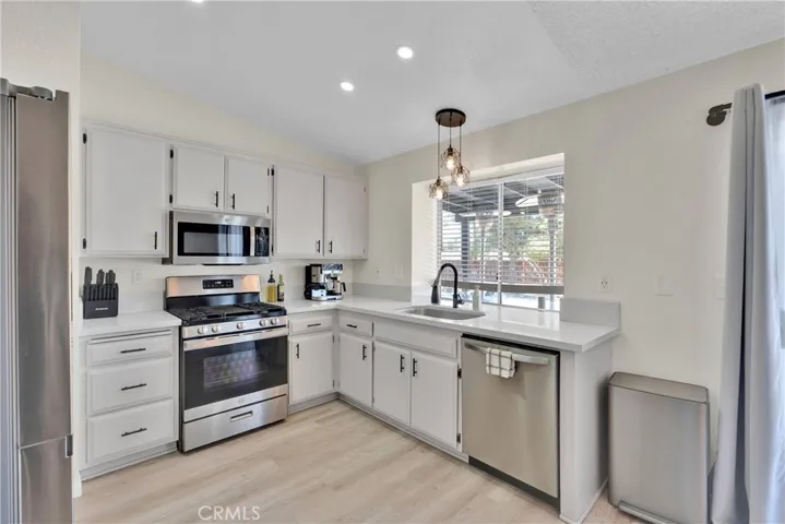 The cozy living room features a bold painted fireplace and flows seamlessly into the dining area, perfect for entertaining or relaxing evenings in. The kitchen has been tastefully updated with quartz countertops, freshly painted cabinetry, and newer stainless steel appliances.