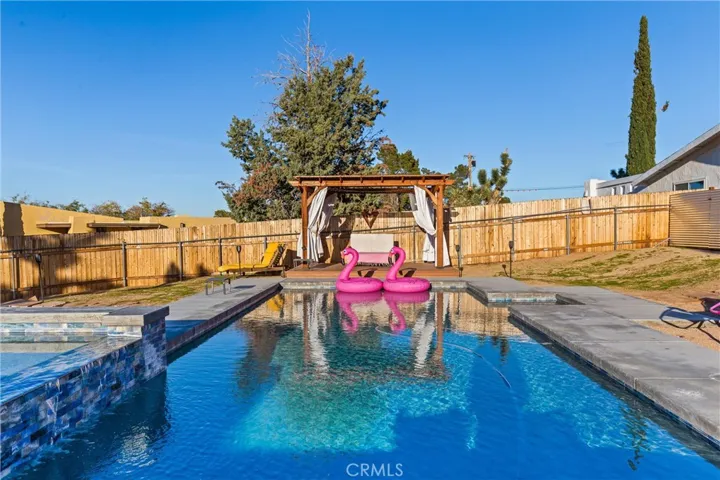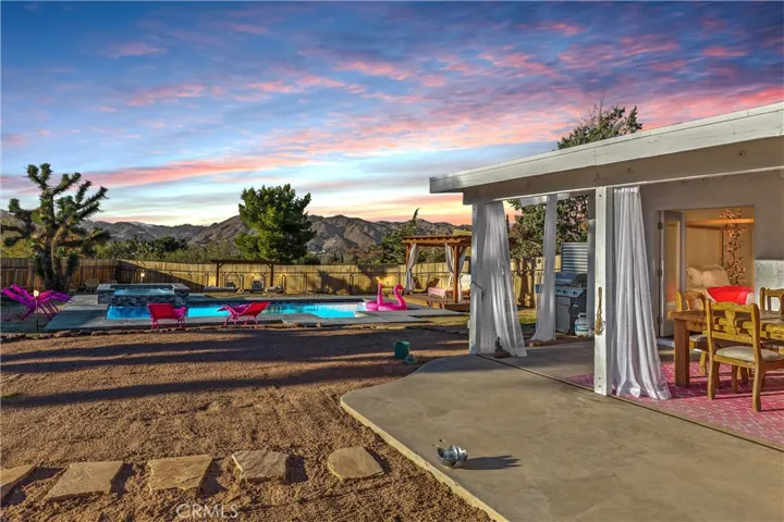 Discover the perfect blend of desert charm and modern comfort in this beautifully updated three-bedroom, two-bath home situated on a generous half-acre corner lot in Yucca Valley’s desirable Storey Park community. Designed with indoor–outdoor living in mind, this home features an inviting open layout with abundant natural light, neutral finishes, and a seamless flow for relaxing or entertaining. The chef-friendly kitchen offers crisp white cabinetry, granite countertops, and stainless steel appliances, while the cozy living area is anchored by a classic fireplace. Step outside to your own private oasis—complete with a sparkling 2022 pool, elevated spa, and a spacious baja shelf perfect for lounging. The backyard is fully fenced and thoughtfully designed with multiple spaces to unwind, including a covered patio ideal for dining, a wooden deck with a stylish cabana for shaded relaxation, and additional seating areas surrounded by Joshua Trees and mountain views. This layout makes it an excellent option for a primary residence, vacation retreat, or short-term rental investment (buyer to verify). Additional upgrades include owned solar (approx. 3 years old), dual-pane windows, central heating and air, a newer evaporative cooler, and a dedicated dog run. Just minutes from Joshua Tree National Park, local shops, dining, schools, and outdoor recreation, this property offers the perfect mix of tranquility, convenience, and desert-lifestyle living.