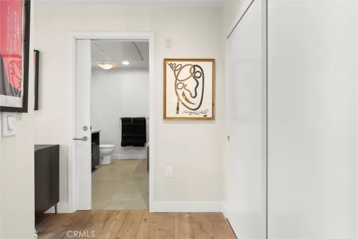 Stroll to shops, hit the gym or simply enjoy a weekend relaxing at this chic Metropol condo in the heart of Hollywood. Conveniently located on the first level, the two-bedroom, two-bath design is bright, open and bathed in abundant natural light that illuminates sophisticated modern design throughout. Natural oak hardwood flooring and a calming light-gray color palette join artful lighting fixtures, space-saving pocket doors and luxurious Carrara marble bath finishes. Entertain easily in a living room that flows to a large and private patio in one direction, and the dining room and kitchen in the other. Uplit and underlit cabinetry with white uppers and black lowers accompany handsome granite countertops, a full mosaic-tile backsplash and a peninsula bar in the kitchen. Enjoy the style and function of high-end stainless-steel appliances, including a French-door LG refrigerator and a five-burner range with griddle. The secondary bedroom has direct access to a bath, and the lux primary suite reveals a sitting area, soaking tub, walk-in rain shower, two sinks
