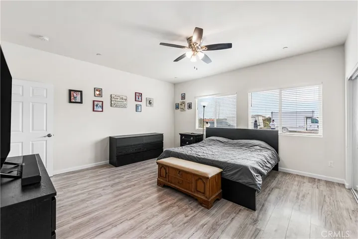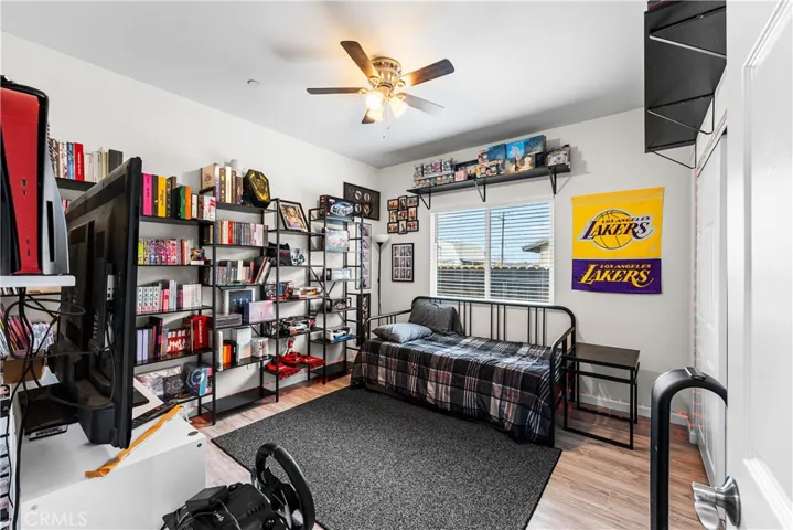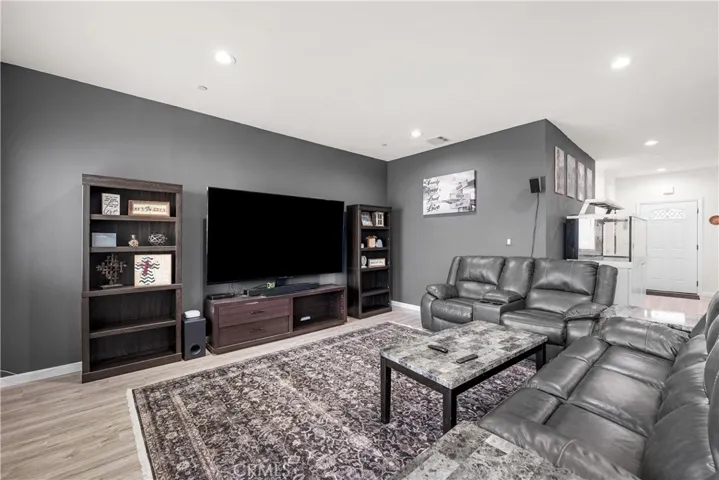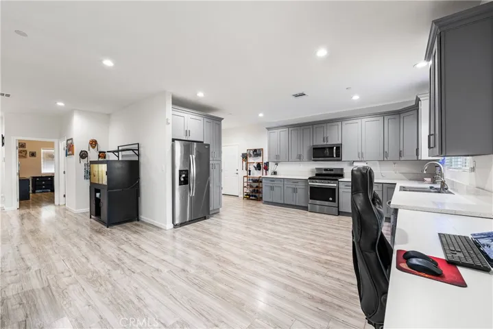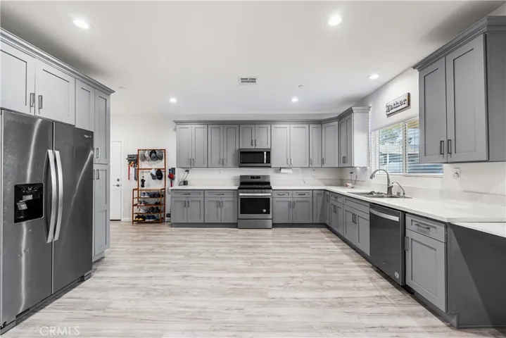 The kitchen is a dream with gorgeous quartz countertops, ample cabinet and counter space, and a dedicated pantry area ideal for small appliances or overflow storage. The gray cabinetry perfectly complements the vinyl plank flooring and modern accent walls, creating a clean and contemporary feel throughout.