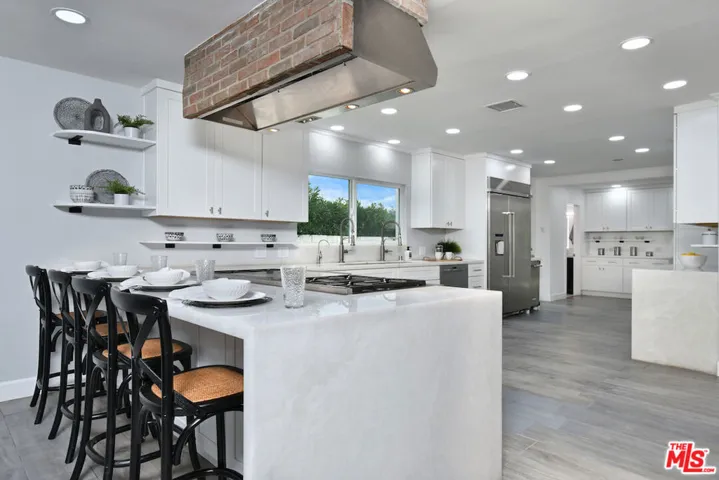 Tucked behind gates on a quiet 6-home cul-de-sac in the Encino foothills, this stunning single-level ranch channels the timeless charm of Jeanne Vandruff’s iconic “Cinderella” homes full of character, with modern contemporary finishes. Step through the formal entry into a breathtaking step-down living room with dramatic beamed ceilings, clerestory windows, and wide-plank wood floors that fill the space with light and air. A massive used-brick fireplace anchors the room complete with an 85″ LG TV for cozy movie nights. Off the entry, a dedicated office opens to a peaceful front patio the perfect spot for morning coffee or a quick work call in the sun. The remodeled chef’s kitchen is a showstopper with quartz counters, shaker cabinetry, a double 6-burner Wolf range with griddle, a breakfast bar, and two refrigerator drawers all overlooking the backyard and flowing seamlessly into the formal dining room for easy entertaining. Need flexibility? A private guest suite just off the kitchen offers a spacious bedroom, full bath, and generous closet space ideal for extended family, guests, or an amazing kids’ playroom. Down the main hall, you’ll find three additional bedrooms and a stylish shared bath. The primary retreat is a true sanctuary with backyard and hillside views, a cedar-lined walk-in closet, and a luxurious spa-style bath featuring a steam shower, dual-sink vanity, and jetted tub with direct access to the pool. Step outside to your own private paradise a beautifully landscaped backyard with a pebble-sheen pool and Baja shelf, built-in brick bench seating, putting green, and multiple lounging and dining areas perfect for gatherings under the stars. With an attached two-car garage, gated parking for multiple vehicles, and an unbeatable location near Lanai Road Elementary, Encino Little League, Balboa Rec Center, and all the best shops and restaurants this home truly has it all. 4053 Harclare Lane a private, sunshine-filled escape that blends classic California charm with modern comfort. Come see why everyone’s talking about it!