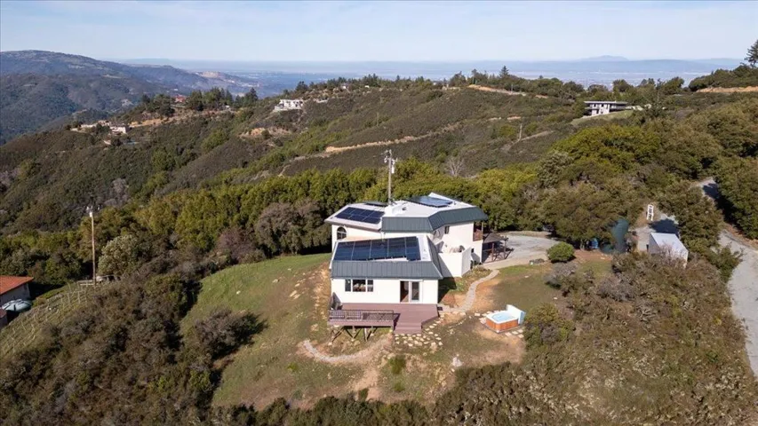 Luxury High-Tech Solar Home | Off-Grid Backup, NEM2, Gigabit Fiber. Ideally situated near downtown Saratoga’s restaurants, shopping, coffee, wine tasting, & more. Near top-ranked Saratoga schools! Experience an exceptional blend of stunning views & prime location in this Saratoga residence. On appx 2.3 acres, this 4 bedroom home offers ~2,688 sq ft of thoughtfully designed living space with breathtaking panoramic views stretching from Monterey Bay to the San Francisco Bay. The gourmet kitchen features a center island, shaker cabinetry, granite counters, & modern stainless appliances, seamlessly connected to the dining area & overlooking a massive deck & spectacular vistas -ideal for everyday living & entertaining. The expansive living room showcases vaulted ceilings, a fireplace, and dramatic picture windows that fill the home with natural light. The spacious primary retreat includes a walk-out balcony, en-suite bathroom with walk-in closet, creating a peaceful sanctuary with unparalleled outlooks. Enjoy movie nights in the separate family room complete with a projector screen! Smart, energy-efficient features include owned solar w/ 2 Tesla batteries, backup generator, 2 EV charging stations, newer roof, whole-home water filtration & ozone system. Relax in the bubbling hot tub.