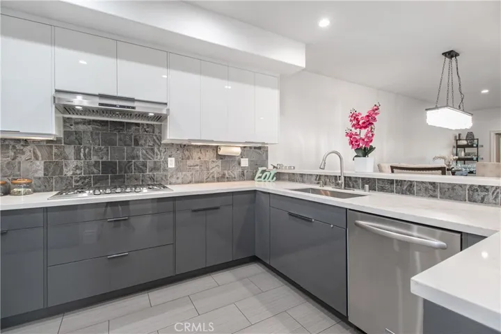 This beautifully updated unit offers three bedrooms and two-and-a-half bathrooms within the prestigious, gated Creekside community. An open-concept layout is highlighted by soaring vaulted ceilings and abundant natural light. The newly remodeled chef’s kitchen features a spacious refrigerator, a professional five-burner range and cooktop, and views to the backyard and family room, all seamlessly flowing into the main living areas. The family room is anchored by a striking glass-burning fireplace, creating a warm yet modern focal point.