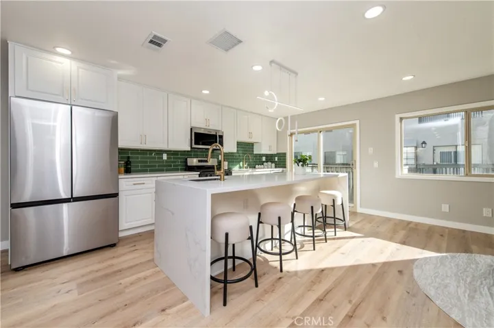 The open-concept floor plan features 3 bedrooms and 2.5 bathrooms, soaring high ceilings, and abundant natural light. The spacious primary suite is a true retreat, highlighted by a luxurious spa-style bathroom with stunning designer showers and modern LED mirrors. The home showcases high-end finishes throughout, including a designer open kitchen equipped with a gas stove, a striking modern fireplace, and sleek glass stair railings. Additional upgrades include new recessed LED lighting, brand-new luxury vinyl hardwood flooring, and brand-new dual-panel windows and sliding doors.