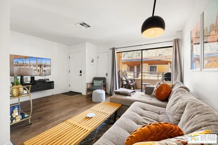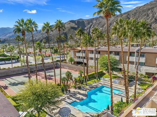 SUCCESSFUL SHORT TERM VACATION RENTAL just blocks from downtown Palm Springs dining, shopping, and entertainment. Located within the gated Biarritz community, this top floor 1 bedroom, 1 bath residence is offered turnkey furnished and is already proven as an income producing property. Ideal as a short term rental, longer term investment, weekend retreat, or full time residence. Dual balconies deliver a mix of pool and mountain views, adding strong guest appeal and indoor outdoor living. The open living, dining, and kitchen layout with pass through design maximizes usability and rental functionality. The spacious ensuite primary bath has been tastefully updated. Biarritz amenities include a large swimming pool, two spas, two tennis courts, secured bike storage, laundry rooms, and assigned covered parking. Prime location moments from the core of downtown Palm Springs, a consistent driver of rental demand. Low HOA fee supports strong net potential. Land Lease is currently $126.63/mo and expires in 2046.