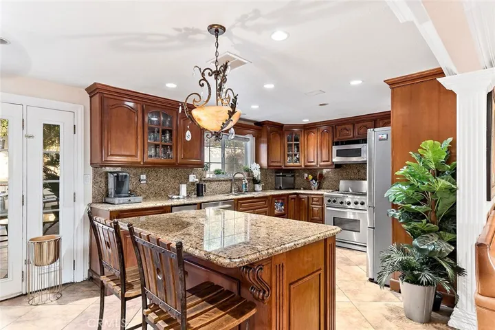 West Covina two level home features double door entry, 4 Bedrooms, 2.5 Bathrooms , 3 cars attached garage and spacious backyard for family activities. Spacious Remodeled kitchen cabinets with granite countertops, tiles flooring, dish washer and trash compactor. Large cozy family room with fireplace, crown molding, recess lighting and wood flooring. Dining room with French door access to backyard. Second spacious living room featuring full size bar, bar stools, Wall mount TV, tiles flooring and French door access to backyard. All 4 bedrooms upstairs with hardwood flooring and ceiling fan. Master bedroom features fireplace and walk-in shower. Covered patio with outdoor fire place, U Shape outdoor kitchen island with bar top and hard top pergola. Minutes away to restaurants, shops, Target, Home Depot, and CVS. Easy access to 10 and 60 Freeway.