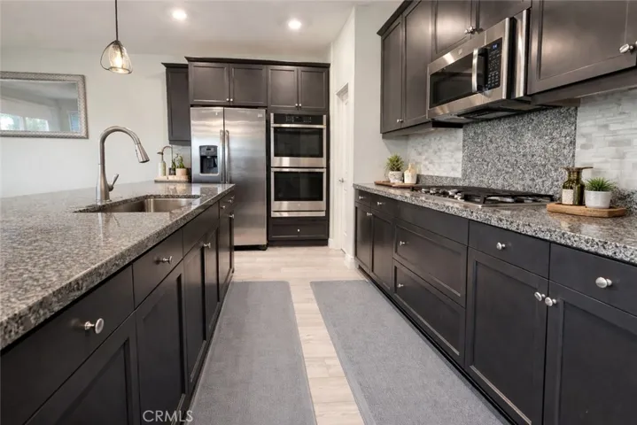 This home is situated within the highly desirable Gabion Ranch community. Residents enjoy access to two resort-style recreation centers with pools and spas, a children’s wetland-style splash play area, and multiple Gabion Ranch parks. The community is enhanced by signature lighted entry monuments at all entrances, creating a warm and welcoming arrival. This exceptional two-story residence features Lennar’s highly sought-after Next Gen® suite, ideal for multigenerational living. It is the only Next Gen floor plan in the community offering a private, gated front patio, providing added privacy and charm. The suite includes a separate entrance, living area, kitchenette, bedroom, full bathroom, in-suite laundry facilities, and the refrigerator is included. The main home offers a bright and open first-floor layout where the Great Room, kitchen, and dining area seamlessly connect—perfect for both everyday living and entertaining. The refrigerator in the main house is also included. Upstairs, three spacious bedrooms are arranged around a versatile loft, ideal for a home office, media room, or additional living space. The home is loaded with upgrades, including 3-inch upgraded baseboards, wood plank flooring throughout the downstairs, primary bedroom, and laundry room, and a kitchen backsplash with upgraded cooktop and grates. The backyard is a true tropical retreat featuring custom planters, a retaining wall, colored concrete, a covered patio, and a 10×10 eight-person dual-jet jacuzzi with cover, included with the sale plantation shutters on most windows, a roll-up shade at the sliding glass door, and a striking $9,000 upgraded front door with full beveled leaded glass. Most rooms include ceiling fans and light fixtures (select fixtures excluded). Energy efficiency is a standout feature with 27 solar panels, including fully owned panels and nine leased panels from the original builder, providing approximately 98% off-grid living. Average SCE electric bills are approximately $8 in summer and $12 in winter. A dual Tesla battery backup system is available as a negotiable option. A 3-car tandem garage with a ceiling-mounted storage rack, is pre-wired for an EV charger, includes a generator hookup for emergencies, and is pre-plumbed for a water softener. A SimpliSafe alarm system and cameras are installed and negotiable. This thoughtfully upgraded home offers flexibility, efficiency, and modern comfort—perfectly designed for today’s lifestyle.