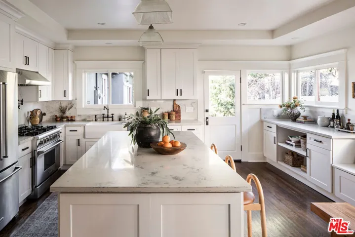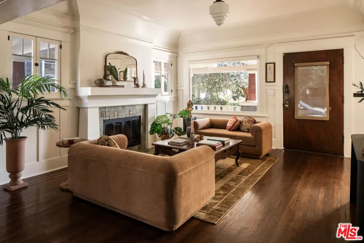 The Sepulveda Residence :: Builders Gabbert & O’Neil :: 1911 :: Jefferson Park HPOZ :: Within one of Los Angeles’ most beloved early 20th-century neighborhoods – celebrated for its exceptional Arts & Crafts architecture and historic charm – stands 2321 W 31st St, a superior example of the architectural movement of its time. Remarkably, this elegant bungalow, quaintly positioned behind a majestic eucalyptus and layers of California native landscaping, was once owned by Roman Dolores Sepulveda as well as occupied by several ancestors of the Sepulveda family, prominent Los Angeles pioneers whose namesake proudly graces the city’s longest street. This 3-bed, 2-bath, 1,549 sq ft residence was thoughtfully restored and updated in 2017, achieving a stellar blend of authentic Craftsman character and modern upgrades. From the street, the home warmly welcomes you with an expansive wrap-around porch, classic shake-shingle exterior, and wide quarter-sawn oak front door. Inside, the living and dining rooms are adorned with distinguished millwork, original hardwood floors, wainscoting, casement windows, and a Batchelder-style tiled fireplace that anchors the space with warmth and character. Period colonnades gracefully flank the entry to a generously sized modern kitchen, creating an open feel enhanced by shaker cabinetry, quartz countertops, and a spacious island. Fully equipped with high-end appliances-including a gas range, wine/beverage refrigerator, microwave, dishwasher, pot filler, and full-size refrigerator. The kitchen is smartly designed for entertaining, flow, and ample storage. The gloriously sunlit den, featuring a broad pocket door, offers flexibility as an office or additional bedroom. At the rear of the home, the large primary suite provides a peaceful retreat with ample walk-in closets and a substantial bathroom fitted with dual sinks, a walk-in shower, and a separate clawfoot tub illuminated by an antique Art Deco pendant. Outside, the backyard offers a lush and private oasis surrounded by mature podocarpus hedges, cactus, and grapevines. A seamless deck hatch provides access to a basement for additional storage, while a motorized gate leads to a finished garage suitable for parking or flex space. Practical amenities include laundry, HVAC, a 200-amp electrical panel and rewire, copper plumbing, Nest thermostat, tankless water heater, security camera system, landscape lighting, and irrigation. The location is unbeatable-just moments from local favorites such as Papi’s Tacos, Highly Likely, South LA Cafe, Harold & Belle’s, Halfday Coffee, Johnny’s Pastrami, Maydan Market, and green space at Leslie Shaw Park, with easy access to freeways and Metro lines. A truly special opportunity to own a historic Craftsman with enduring character, elevated by classic restoration and modern comfort, in one of South LA’s most cherished neighborhoods, known for its deeply rooted and unmatched sense of community.