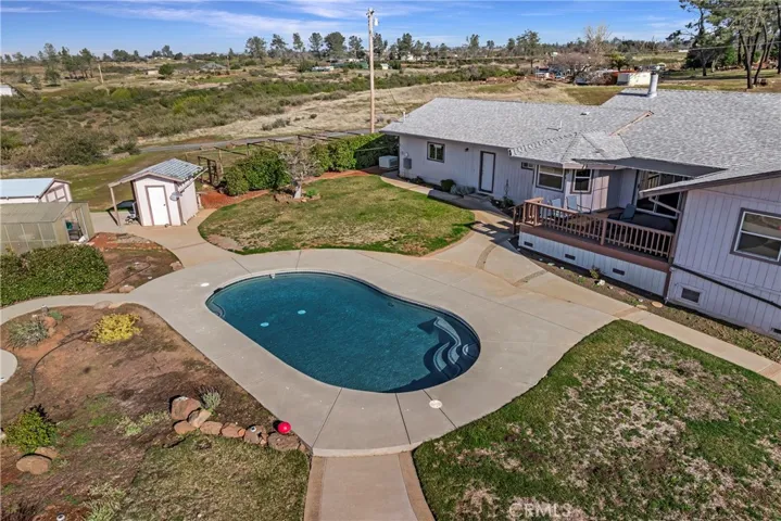 Fantastic Lower Paradise Location for this 15 ACRE property. VIEWS of Chico, Sutter Buttes and the Coastal Mountain Range! Have amazing views every day! Looking for space then this is it! Tons of flat area for a SHOP, ADU or both! This 1990 built home offers 3 bedrooms plus office, 2 baths, 3 car garage with 1/2 bath and third bay garage door being extra tall! There is also an in-ground POOL with incredible views!!! New interior paint, Mannington laminate flooring, Marquis carpet with #8 Pad, bathroom faucets, toilets, garage, kitchen and security lights, GE range, LG front load washer and dryer, Pool Pump, booster pump, filter and safety drains, chimney cleaned, and spark screen replaced. The home offers a large living room with vaulted knotty pine tongue & groove ceiling, bay picture window and a floor to ceiling rock hearth with a free-standing Schrader Wood Stove. Off the living room is the dining area & kitchen. The kitchen offers tons of cabinets, solid surface counter tops, breakfast nook, 7′ eating bar and tiled floors. Down the hallway are built in cabinets, spacious guest bedrooms and the office. The primary bedroom has vaulted knotty pine tongue & groove ceilings, views of the valley and a slider to the back deck. The primary bath has dual sink vanity with tiled counters and a tiled step in shower. The guest bath offers tiled counters and a tiled tub/shower combination. There is a cummings back up generator system. The well has a 1000 gallon holding tank. The home is on 9.89 acres and this property is including another undeveloped separate 5 acre property that runs on the south property line. Very close commute to Chico! Landscape in front and back yard. One Year Home Warranty for the next 14 months transferable. This property is ready for a new owner. Video link https://vimeo.com/1058227001?share=copy.
